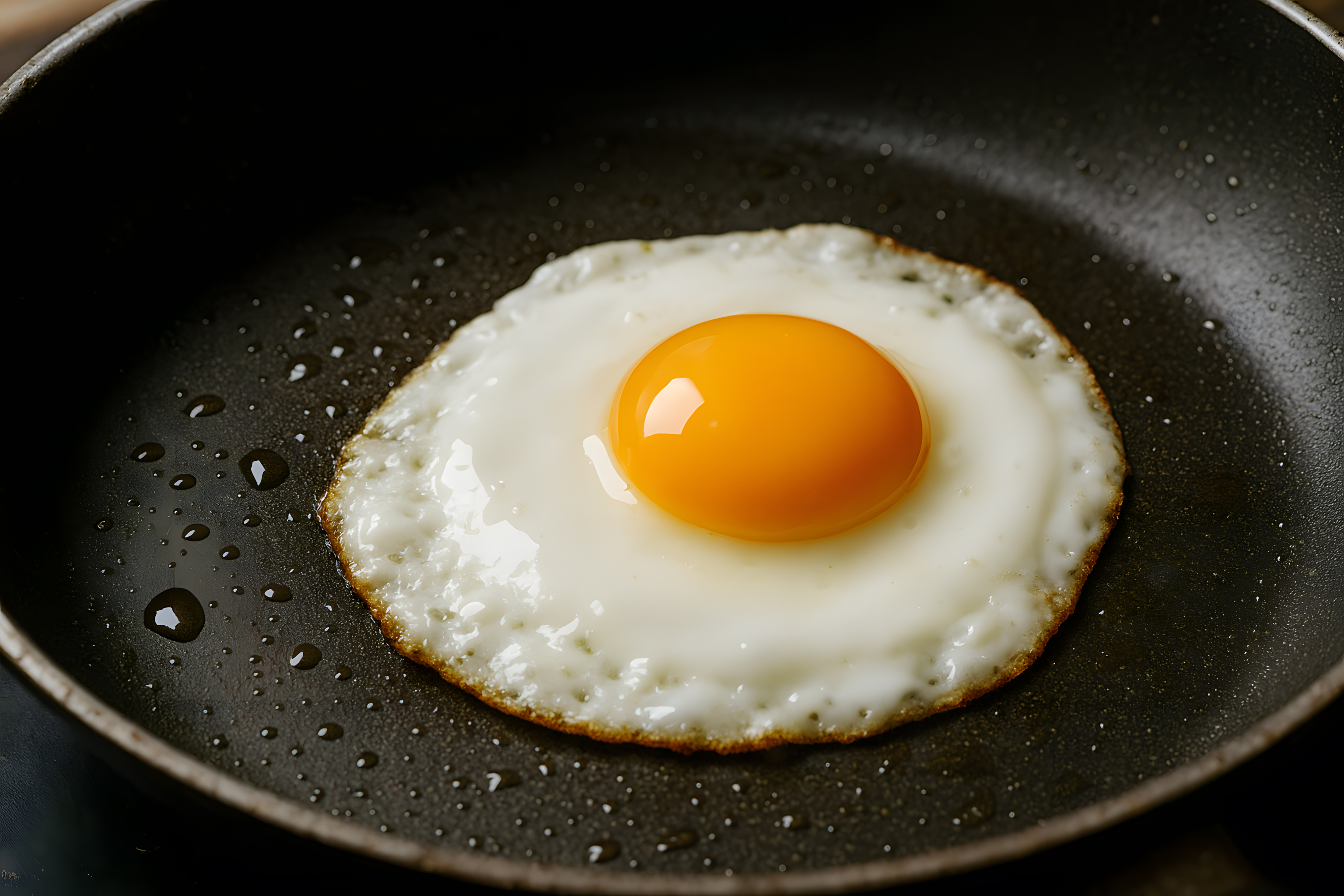 Das Bild zeigt ein frisch zubereitetes Spiegelei in einer Pfanne mit glänzenden Öltröpfchen auf einem dunklen Untergrund. Die Perspektive ist nah und fokussiert, sodass die Details des Eis, wie das knusprige Eiweiß und der goldgelbe Dotter, klar zu erkennen sind. Die Beleuchtung lässt die Texturen und Konturen des Motivs hervortreten und erzeugt einen stimmungsvollen, appetitlichen Eindruck. Dieses Stockfoto in hoher Auflösung eignet sich perfekt für Anwendungen in Kochblogs, Rezeptsammlungen, Lebensmittelwerbung oder -verpackungen sowie für kreative Gestaltungen in sozialen Medien. Es steht unter der Creative-Commons-Lizenz zur kostenlosen Nutzung zur Verfügung.