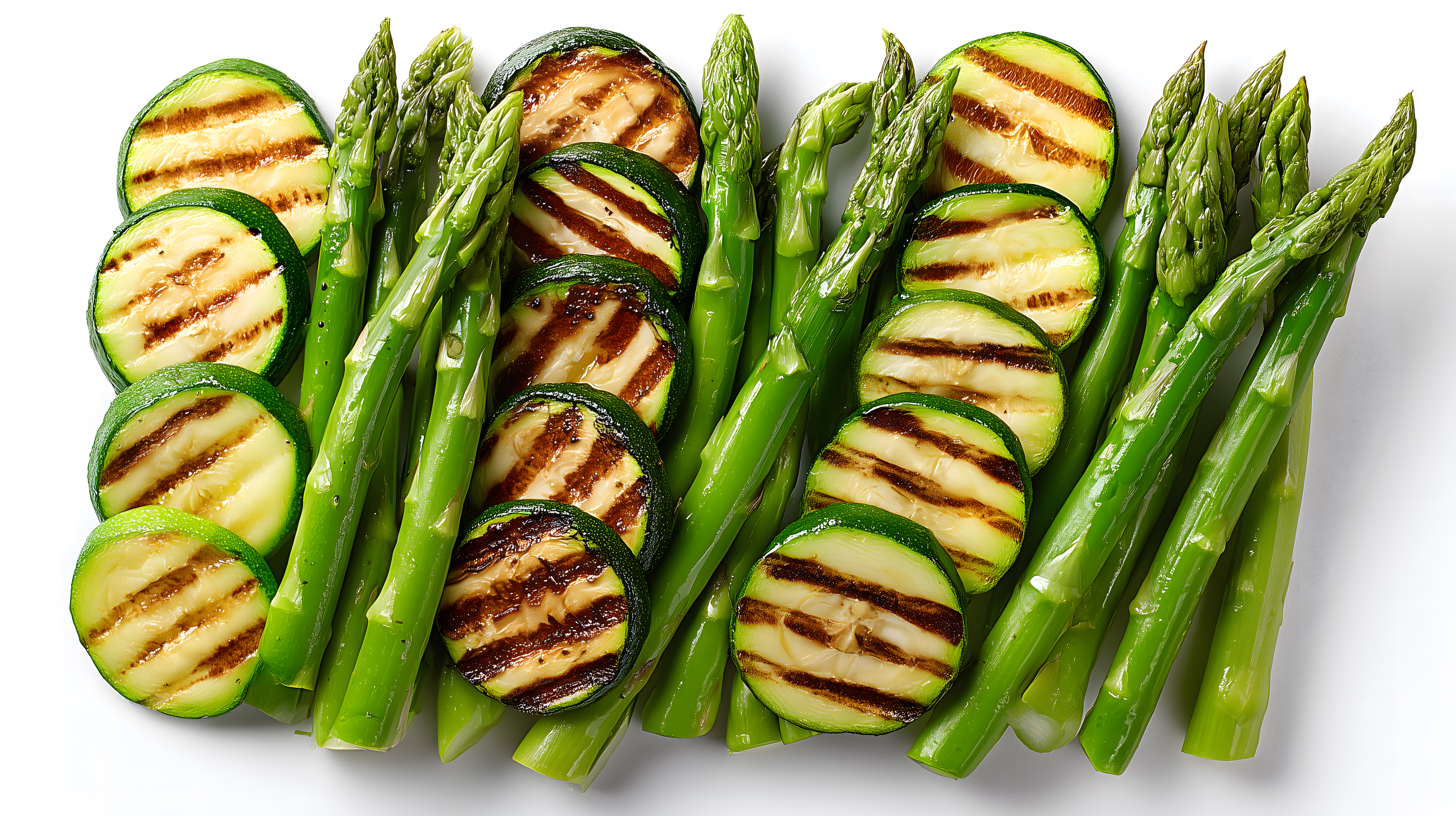 Dieses Bild zeigt ein appetitliches Arrangement von gegrillter Zucchini und Spargel auf einem hellen Holzhintergrund. Die Gemüsestücke sind sorgfältig angeordnet und zeigen eine harmonische Farbpalette von Grün- und Gelbtönen. Die Oberflächen der gegarten Zucchini- und Spargelstangen weisen charakteristische Grillfacetten auf, was dem Gericht eine attraktive, rustikale Optik verleiht. Das Foto eignet sich hervorragend als Stockfoto für Rezepte, Menüs oder Werbekampagnen rund um gesunde, leckere Gemüsebeilagen. Die hochauflösende Aufnahme steht unter einer kostenlosen Creative-Commons-Lizenz zur Verfügung.