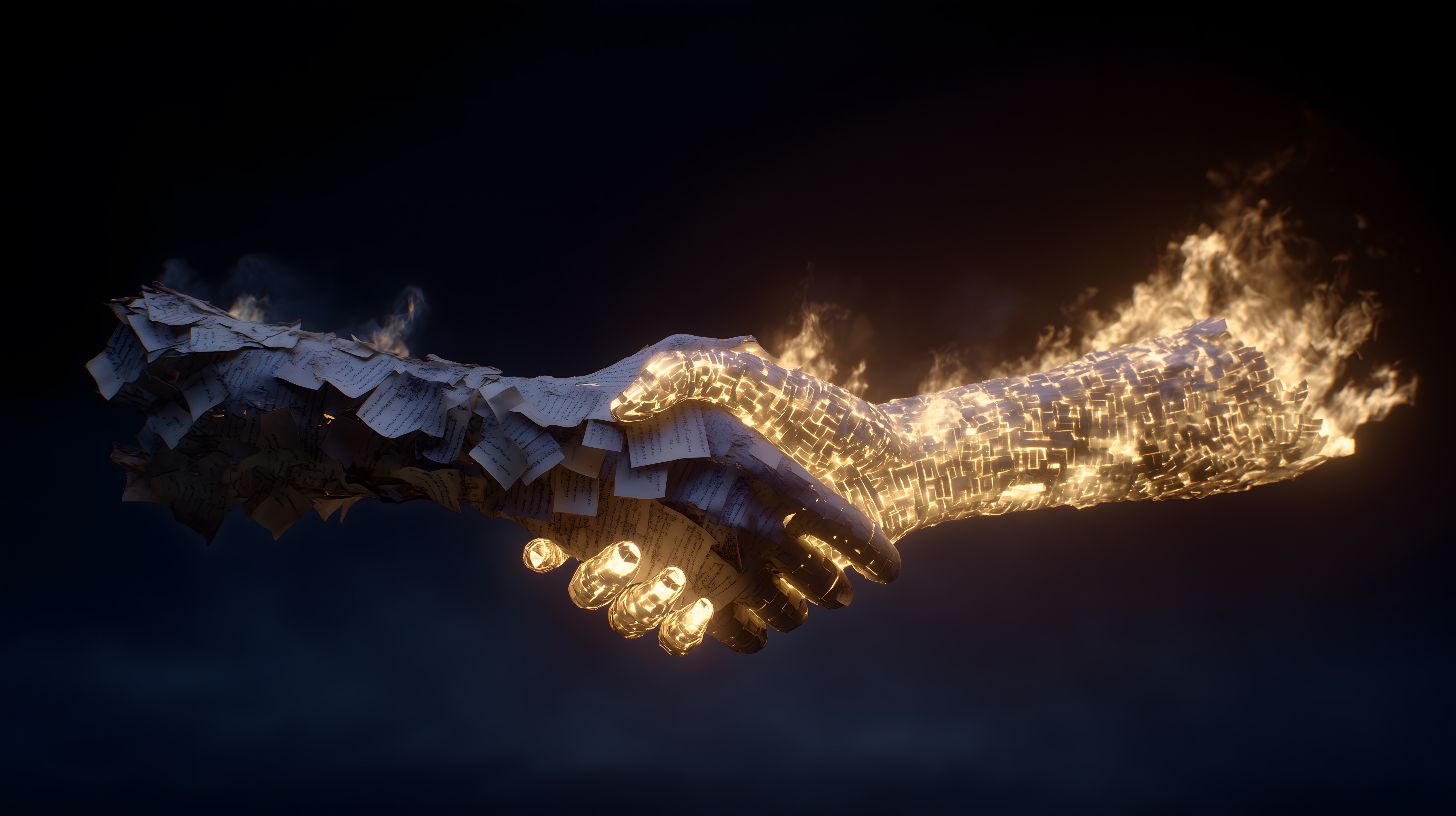 Das Bild zeigt eine symbolische Darstellung einer digitalen Geschäftspartnerschaft. Zwei Hände, die sich in einem Handschlag vereinen, sind aus glühenden Papierelementen und Flammen geformt. Dieses dynamische und kontrastreiche Motiv vermittelt die Idee von Zusammenarbeit, Vertrauen und Innovation in der digitalen Wirtschaft. Das Foto bietet eine faszinierende, abstrakte Visualisierung dieser Konzepte und kann für eine Vielzahl von Anwendungen in Bereichen wie Blogbeiträge, Werbematerial oder soziale Medien eingesetzt werden. Dieses hochauflösende Stockfoto ist unter einer Creative-Commons-Lizenz frei verfügbar.