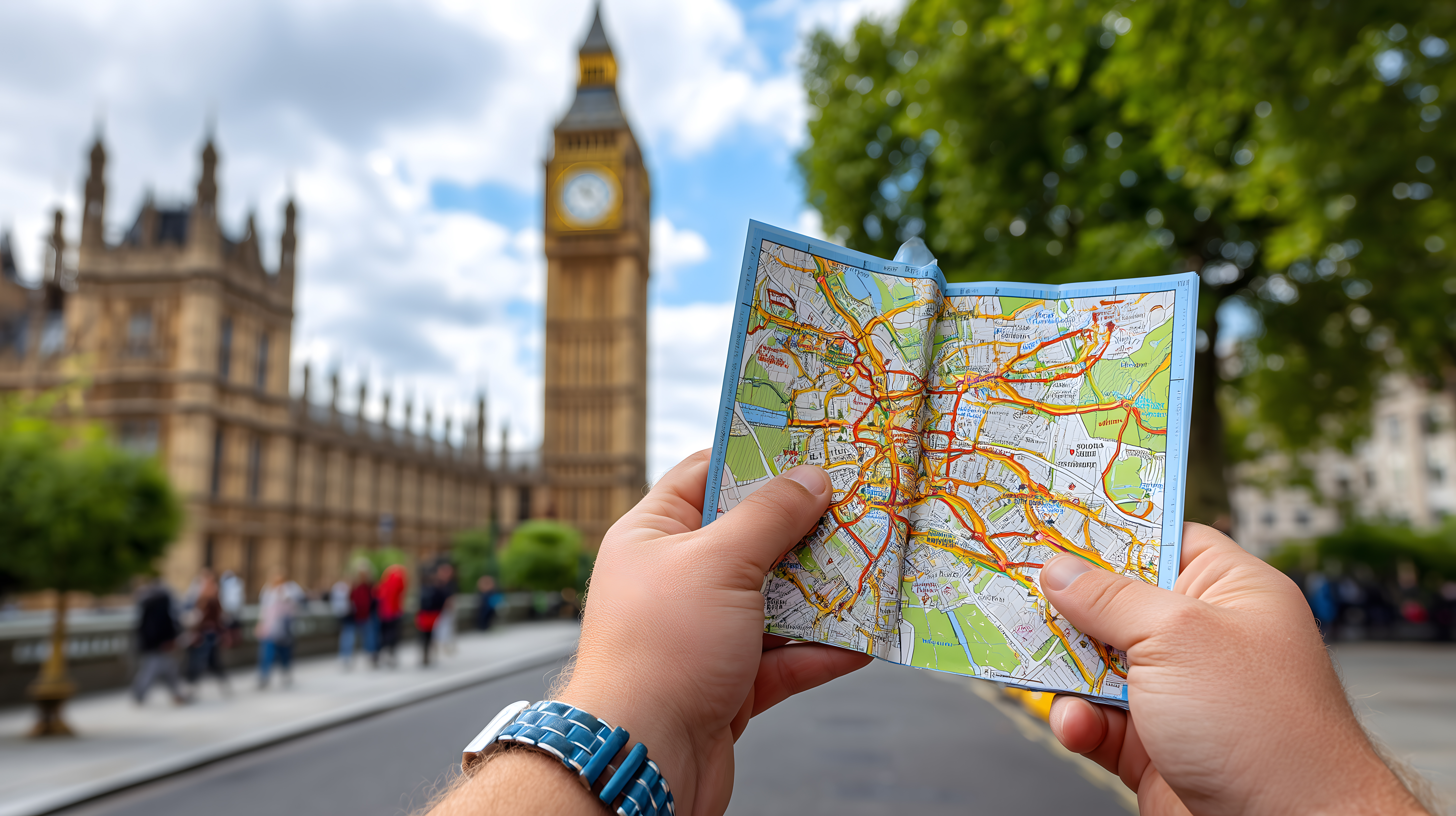 Das Foto zeigt einen Blick auf den Big Ben, die ikonische Uhr am Elizabeth Tower des Palace of Westminster in London. Eine Person hält einen Stadtplan in den Händen und betrachtet ihn offensichtlich, um sich in der Umgebung zu orientieren. Der Betrachter ist aus einer leicht erhöhten Position aufgenommen, sodass der Big Ben sowie die umgebende Architektur und Umgebung gut zu sehen sind. Das Bild vermittelt den Eindruck eines touristischen Erkundungsmoments inmitten der Sehenswürdigkeiten Londons an einem sonnigen Tag.