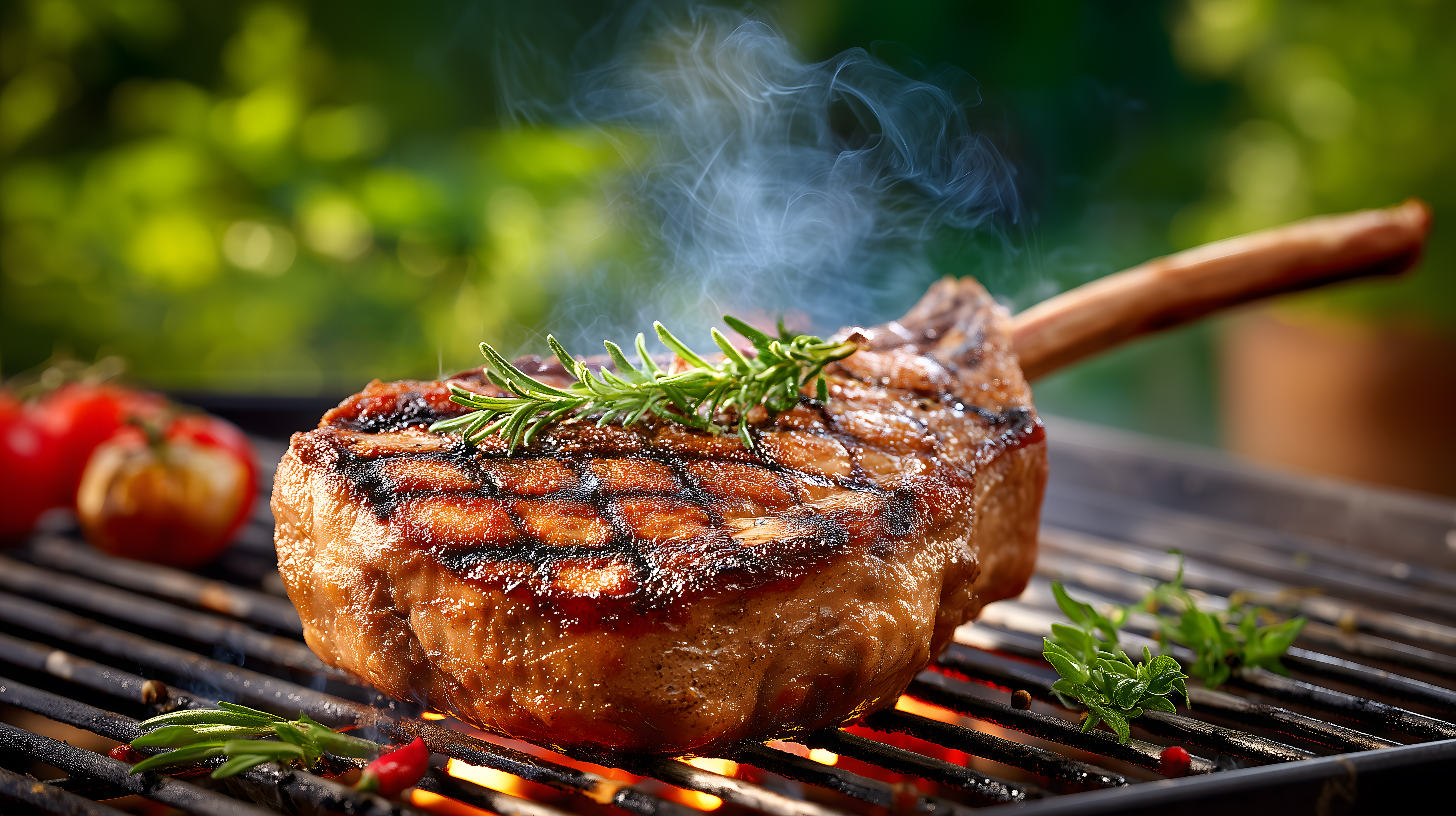 Dieses Foto zeigt ein saftiges, frisch gegarten Tomahawk-Steak, das auf einem Grillrost liegt. Das Fleisch ist von einer knusprigen Kruste umhüllt und wird von köstlichen, aromatischen Kräutern wie Rosmarin geziert. Dichte Rauchwolken und lodernde Flammen verleihen dem Gericht eine authentische, rustikale Atmosphäre. Die faszinierende Nahaufnahme fängt die verlockenden Röstaromen und die intensive Textur des Fleisches perfekt ein. Dieses hochwertige Stockfoto eignet sich hervorragend für Artikel und Werbung rund um Grillspezialitäten, Outdoor-Küche, Kulinarik und Genussmomente in hoher Auflösung und unter einer Creative-Commons-Lizenz.