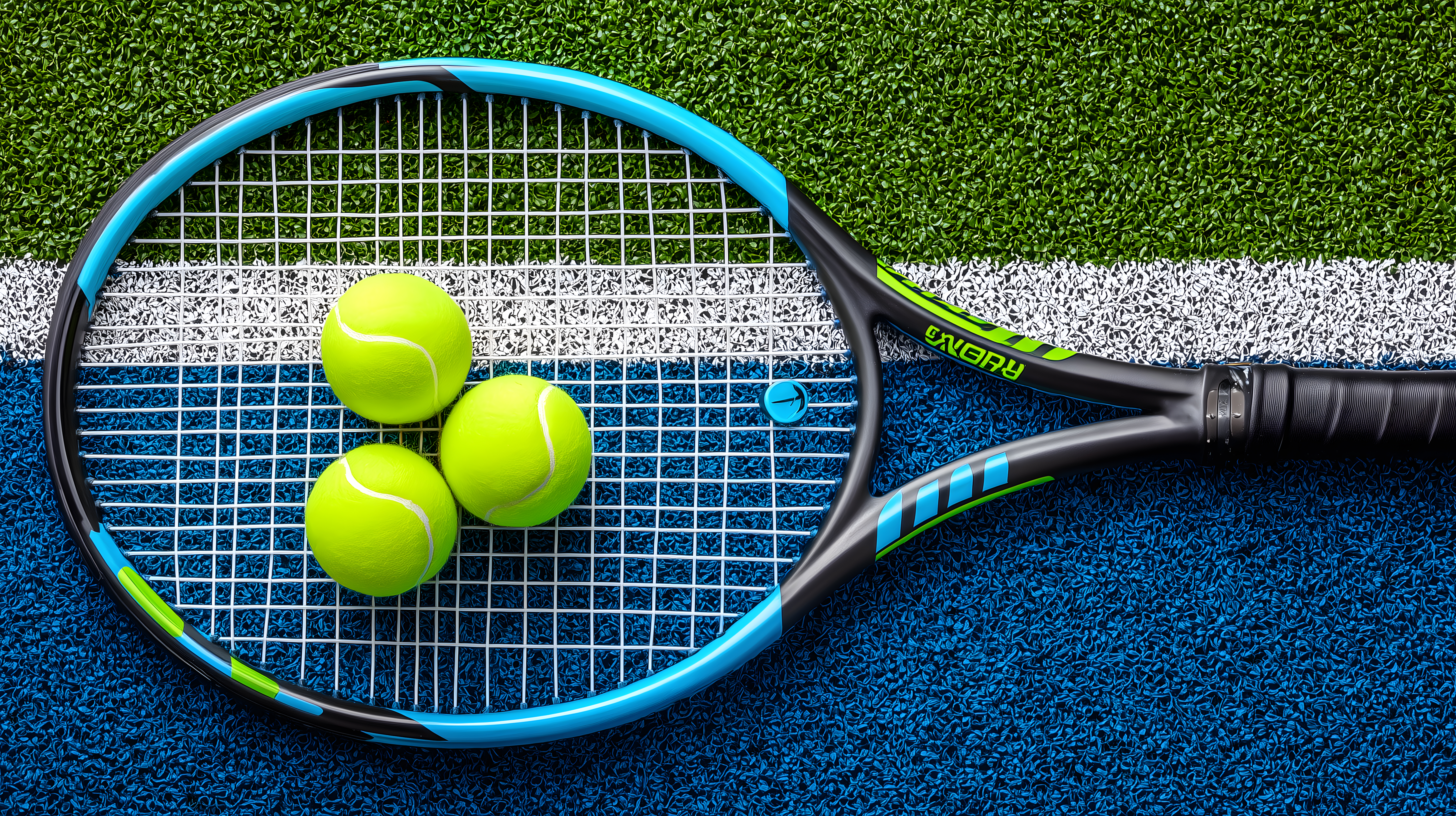 Dieses Stockfoto zeigt einen Tennisschläger mit drei Tennisbällen auf einem Tennisplatz. Der Hintergrund ist ein grüner Rasen mit blauen Markierungslinien, was eine typische Tennisplatz-Umgebung darstellt. Das Bild eignet sich hervorragend für Blogbeiträge, Newsletter oder Social-Media-Kampagnen rund um Themen wie Freizeit, Sport, Wellness und gesunden Lebensstil. Das hochauflösende Foto ist unter einer Creative-Commons-Lizenz frei verwendbar.