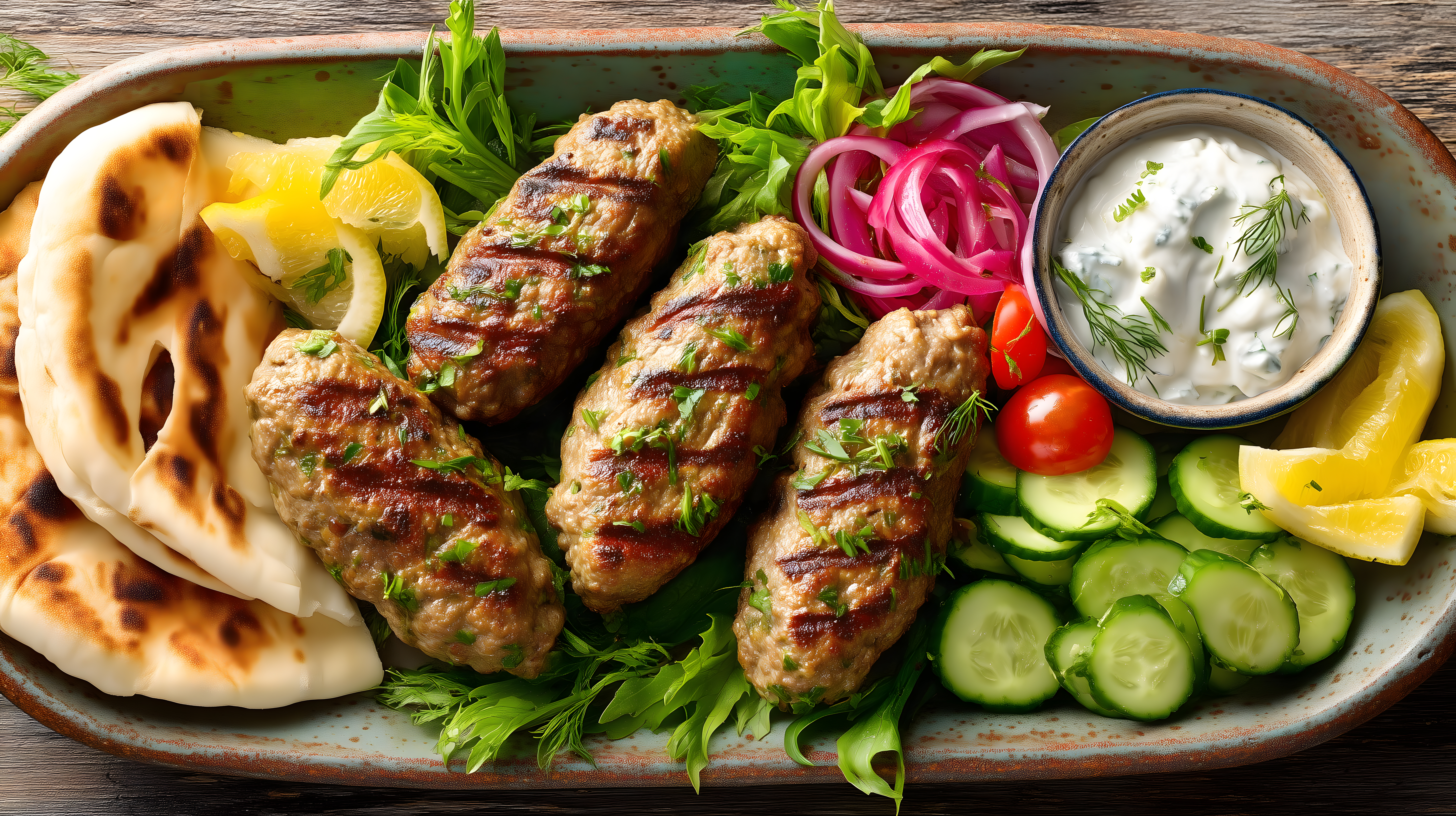 Dieses appetitliche Foto zeigt ein leckeres orientalisches Grillgericht mit saftigen Kofta-Kebabs, frischem Gemüse und würzigem Fladenbrot. Die Kombination aus gegrilltem Fleisch, knackigen Gurken, saftigen Tomaten und der cremigen Joghurt-Sauce verleiht diesem Gericht eine köstliche und authentische Note. Das Foto eignet sich hervorragend für den Einsatz in Blogs, Newslettern, Social-Media-Posts oder Werbematerialien rund um Themen wie Kulinarik, gesunde Ernährung oder internationale Küche. Als kostenloses Stockfoto in hoher Auflösung und unter Creative-Commons-Lizenz ist dieses Bild vielseitig einsetzbar.