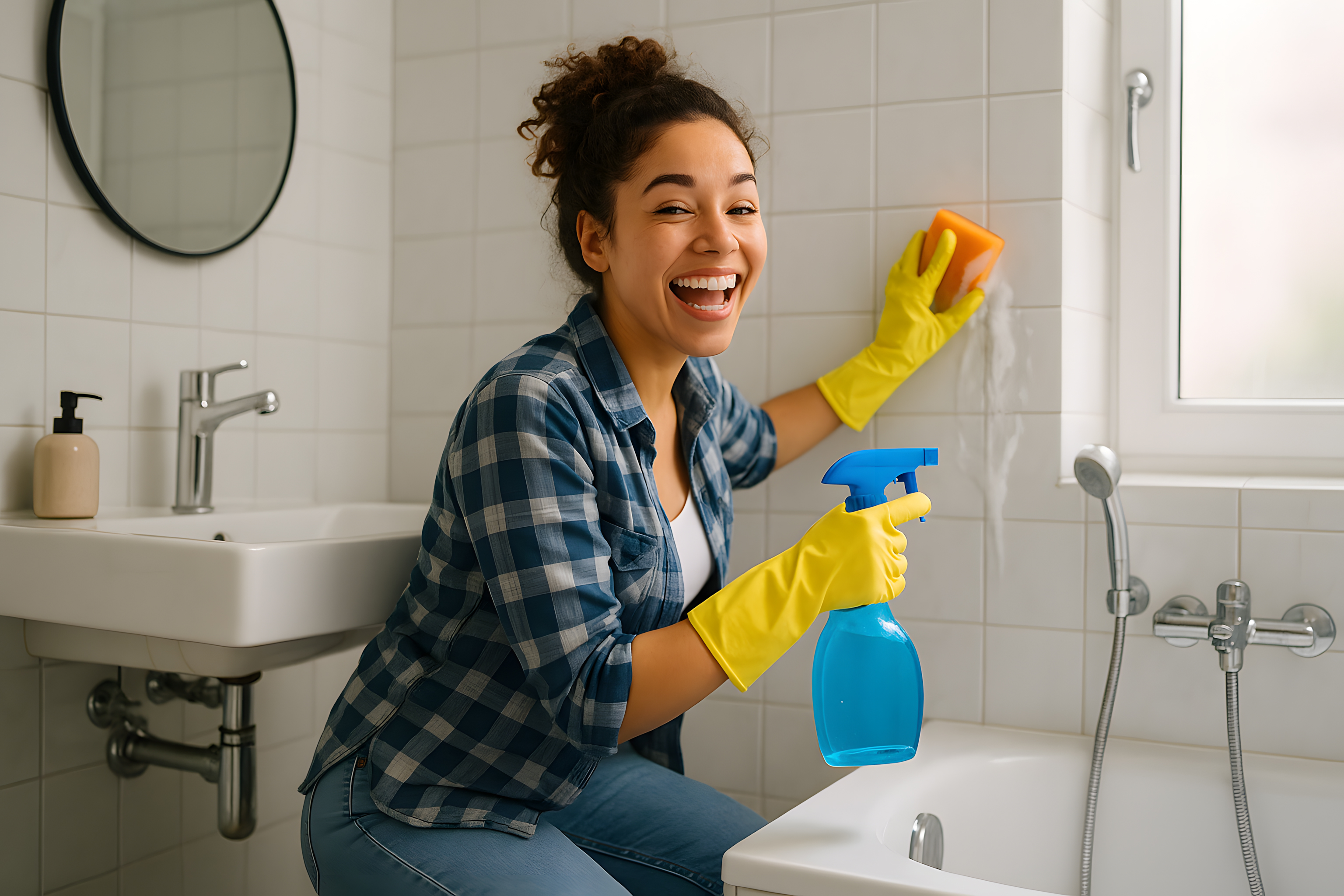 Das Foto zeigt eine lächelnde Frau, die mit Freude und Elan das Badezimmer reinigt. Sie trägt Gummihandschuhe und hält eine Sprühflasche mit Reinigungsmittel in der Hand, mit der sie gerade die Keramikfliesen, den Spiegel und das Waschbecken säubert. Der helle Raum vermittelt ein Gefühl von Sauberkeit und Frische. Dieses kostenlose Stockfoto in hoher Auflösung könnte für einen Blogbeitrag zum Thema Haushaltsführung, Produktwerbung für Reinigungsmittel oder Sozialmedien-Posts zur Darstellung eines ordentlichen, wohnlichen Badezimmers genutzt werden und steht unter einer Creative-Commons-Lizenz zur Verfügung.