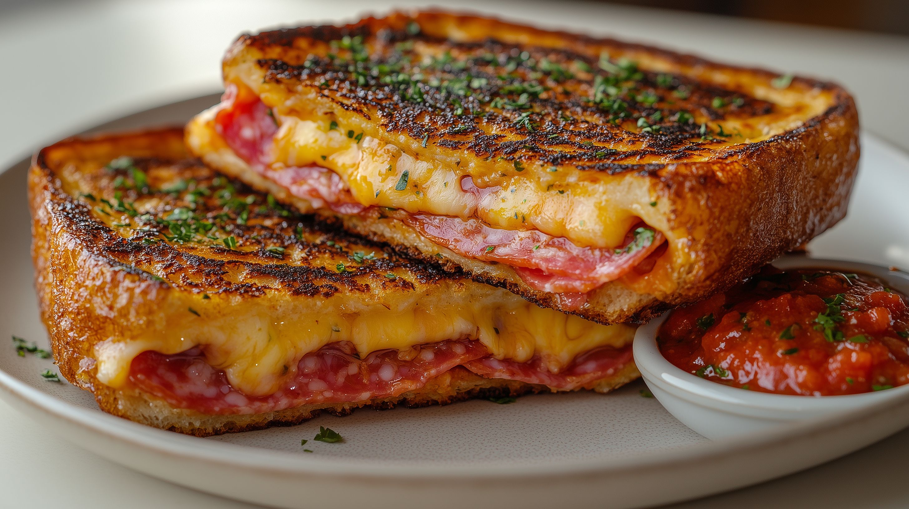 Das Bild zeigt einen appetitlichen, knusprigen Schinken-Käse-Toast, der auf einem hellen Teller serviert wird. Der Toast ist goldbraun gebacken und mit geschmolzenem Käse und Scheiben von kräftigem Schinken belegt. Dazu wird eine Schüssel mit würziger Tomatensalsa gereicht, die den Toast perfekt ergänzt. Die Komposition ist stilvoll und einladend, mit einem Fokus auf die Textur und Farben des Gerichts. Dieses Stockfoto eignet sich hervorragend für Blog-Beiträge, Newsletter oder Social-Media-Postings rund um das Thema Frühstück, Brunch oder leckere Sandwich-Rezepte. Das Bild ist in hoher Auflösung und unter einer Creative-Commons-Lizenz verfügbar.