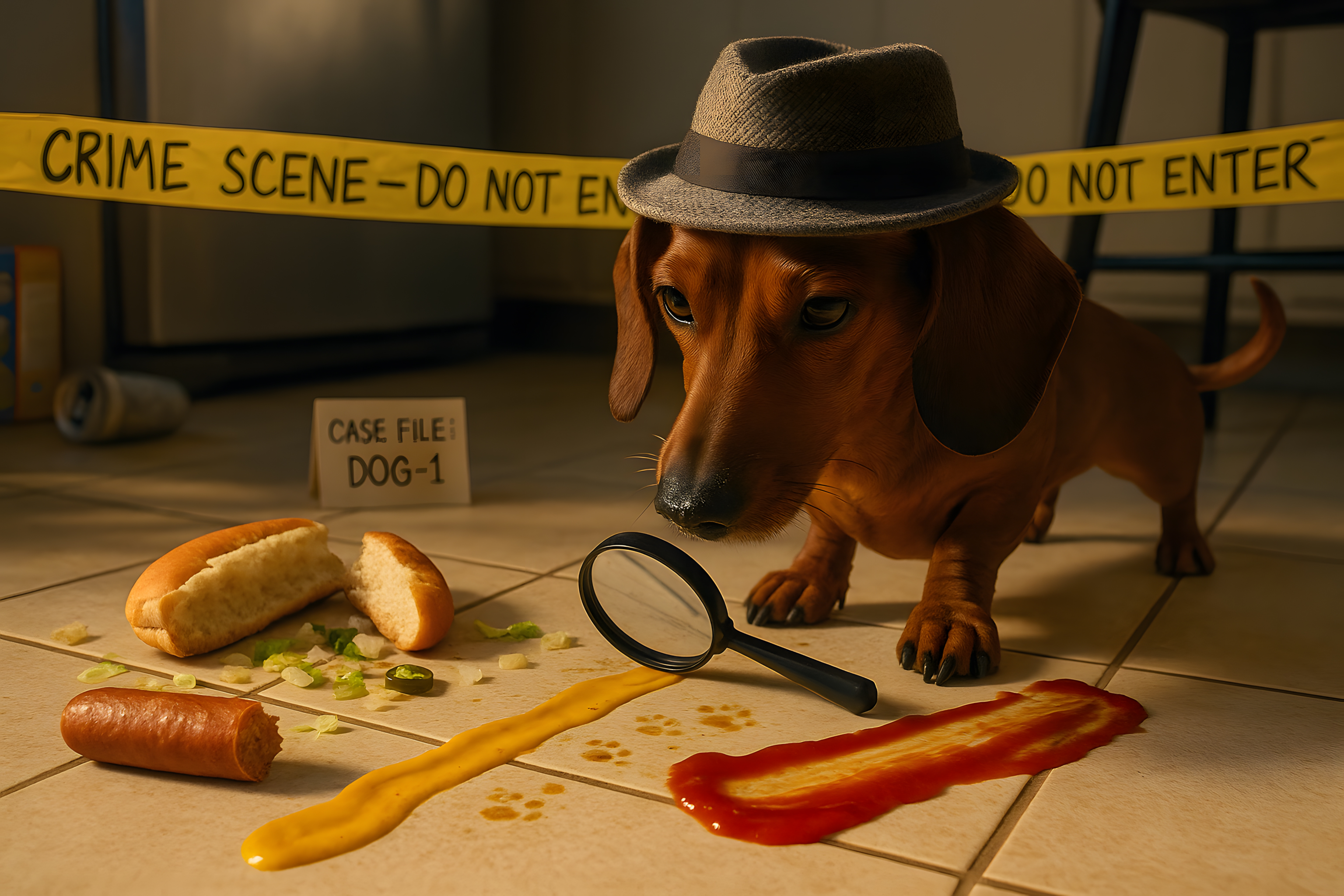 Das Bild zeigt einen braunen Dackel mit einem Detektivhut, der in einer Küche sitzt und einen vermeintlichen Tatort untersucht. Vor ihm liegen ein Hotdog, eine Senfflasche, ein Stück Brot und Ketchup-Spritzer auf dem Boden. Die Szenerie wird durch ein Absperrband als Kriminalfall gekennzeichnet. Der Hund wirkt konzentriert und neugierig, als würde er nach Spuren suchen. Das Foto strahlt eine humorvolle und niedliche Atmosphäre aus und lässt sich gut für Blogs, Newsletter oder Social-Media-Beiträge rund um Haustiere, Krimis oder lustigen Alltag einsetzen. Das hochauflösende Stockfoto ist unter einer Creative-Commons-Lizenz kostenfrei verfügbar.
