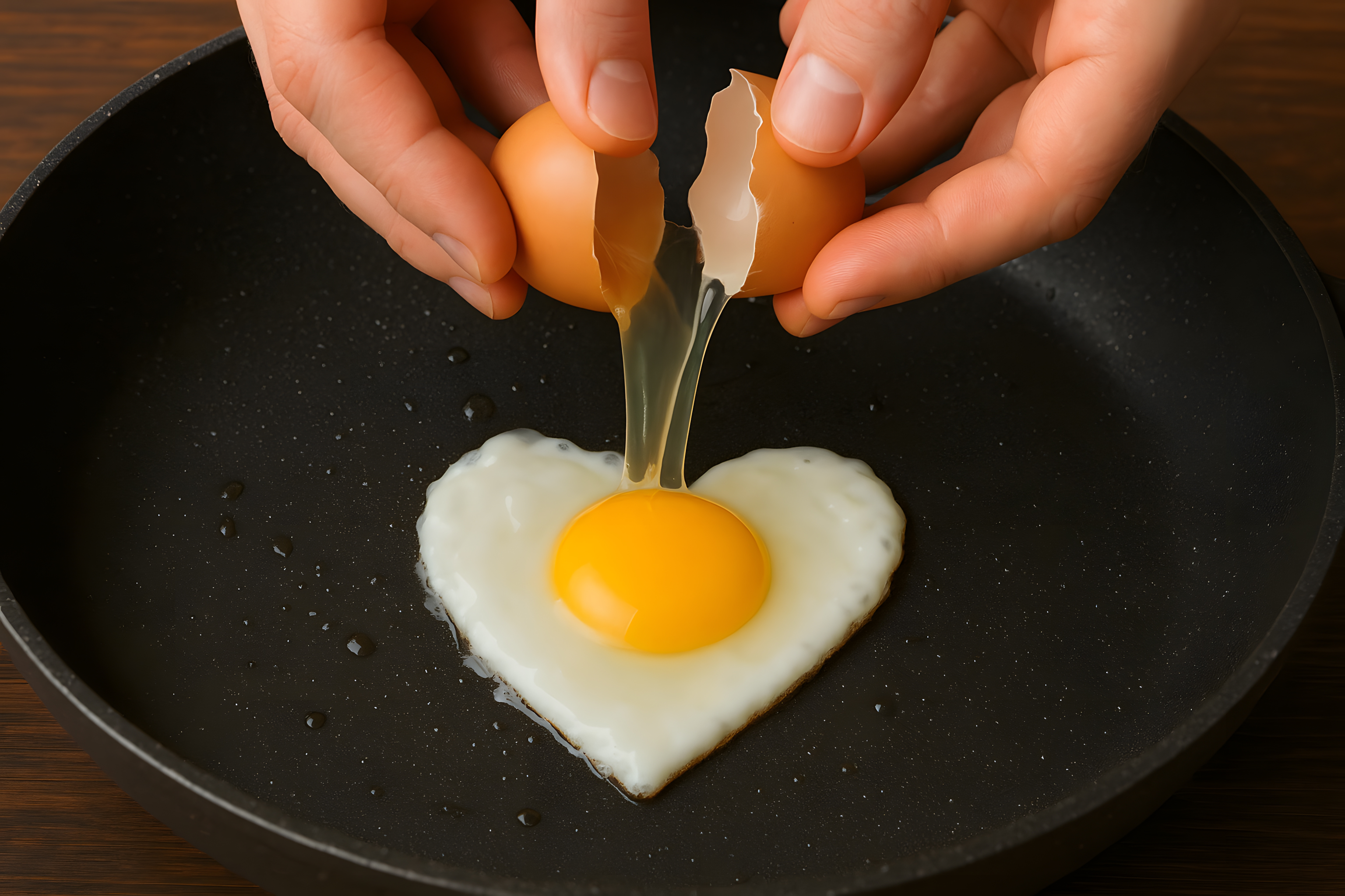 Das Foto zeigt ein herzförmiges Spiegelei, das in einer Pfanne auf einem dunklen Hintergrund gebraten wird. Die Hände einer Person sind dabei zu sehen, wie sie das Ei sorgfältig aus der Schale in die Pfanne gleiten lässt. Das Bild hat eine warme, gemütliche Stimmung und eignet sich ideal für Blogs, Newsletter, Social-Media-Posts oder Werbeanzeigen rund um Themen wie Frühstück, Kochen, Gesundheit oder Romantik. Das hochauflösende Foto ist als kostenloses Stockfoto unter einer Creative-Commons-Lizenz verfügbar.