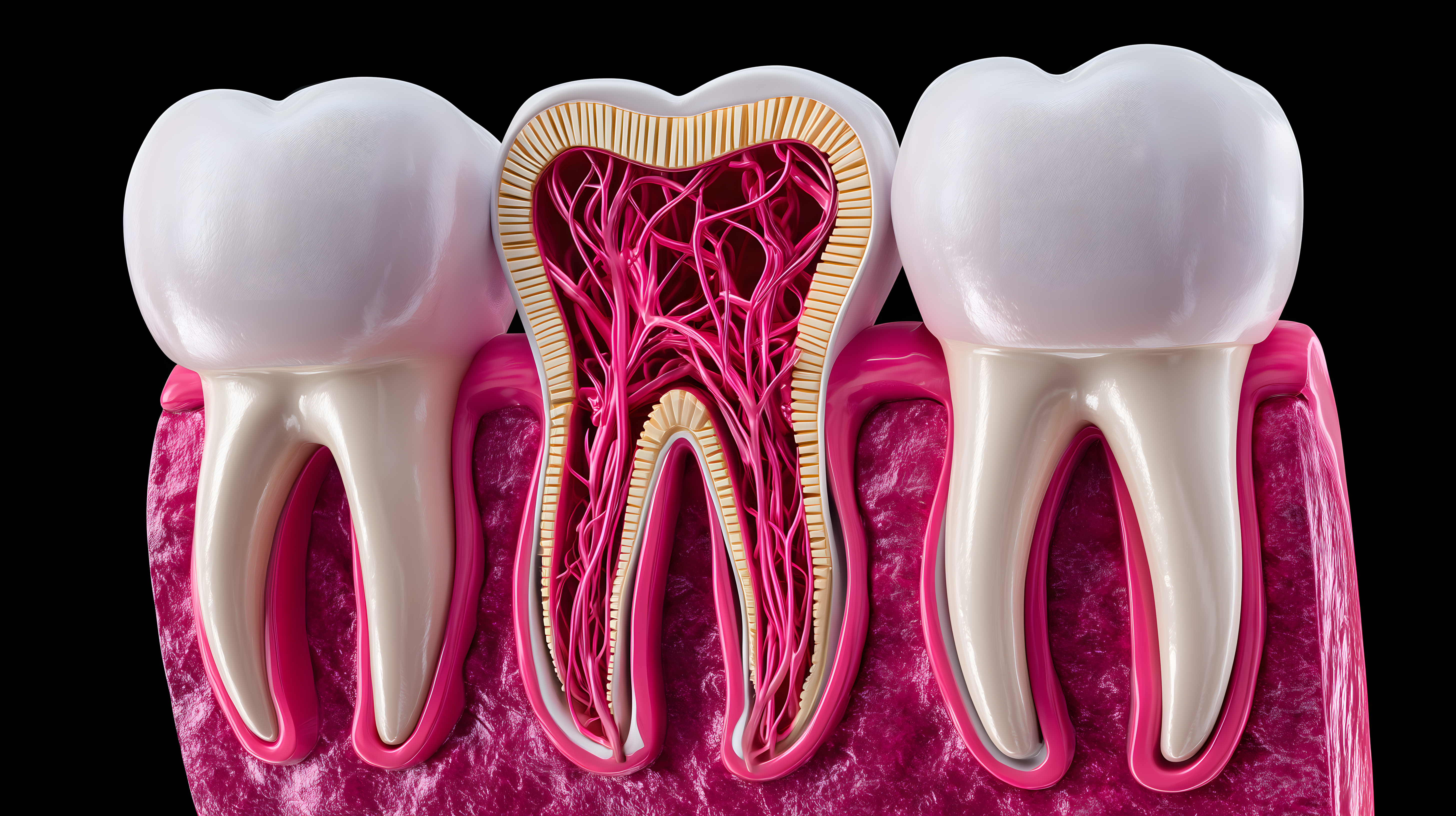 Diese detaillierte, schwarz-weiße Illustration zeigt den Querschnitt eines menschlichen Zahns. Sie bietet einen faszinierenden Einblick in die komplexe anatomische Struktur eines Zahns, mit sichtbaren Nerven und Dentinschichten. Diese hochwertige, wissenschaftliche Grafik eignet sich ideal als Lehrmaterial für medizinische Ausbildungen, Gesundheitsblogs oder andere Bildungskontexte. Das Bild ist in hoher Auflösung verfügbar und kann unter einer Creative-Commons-Lizenz kostenfrei verwendet werden.