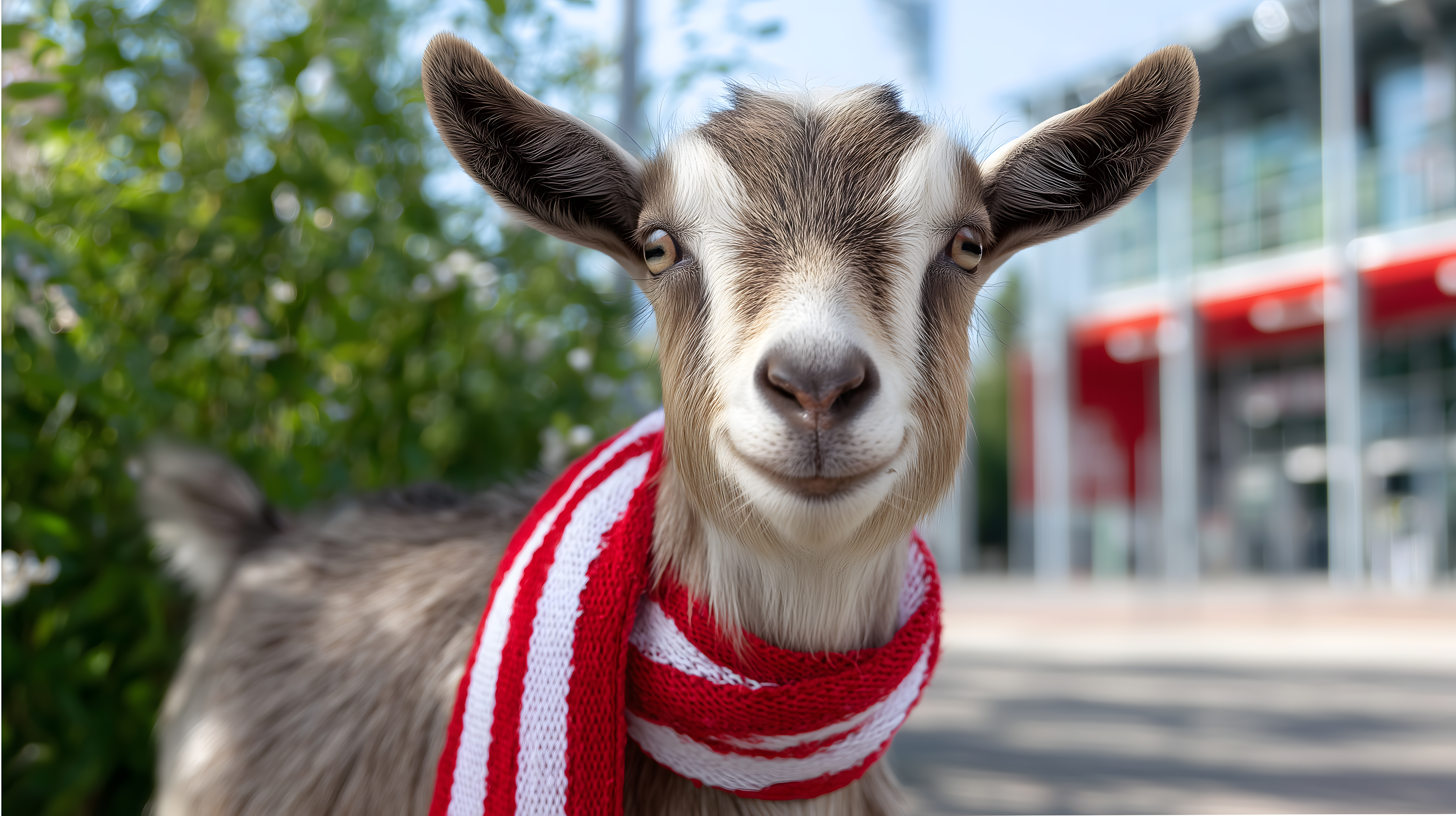 Das Bild zeigt ein charmantes Porträt eines Ziegenböckchens, das in einem roten Schal gehüllt ist und vor einem modernen Vereinsgebäude steht. Das Tier blickt direkt in die Kamera mit einem sanften, fast freundlichen Ausdruck. Das Foto ist farblich sehr kräftig und lebendig, mit den grünen Büschen und Bäumen im Hintergrund, die den Blick auf das Gebäude mit seiner großen Glasfassade lenken. Dieses lustige und dekorative Bild eignet sich hervorragend für die Verwendung in Blogbeiträgen, Newslettern, Social-Media-Kanälen oder Werbekampagnen, die ein heiteres und freundliches Gefühl vermitteln möchten. Als hochwertiges, kostenloses Stockfoto unter einer Creative-Commons-Lizenz steht es für vielfältige Einsatzmöglichkeiten zur Verfügung.