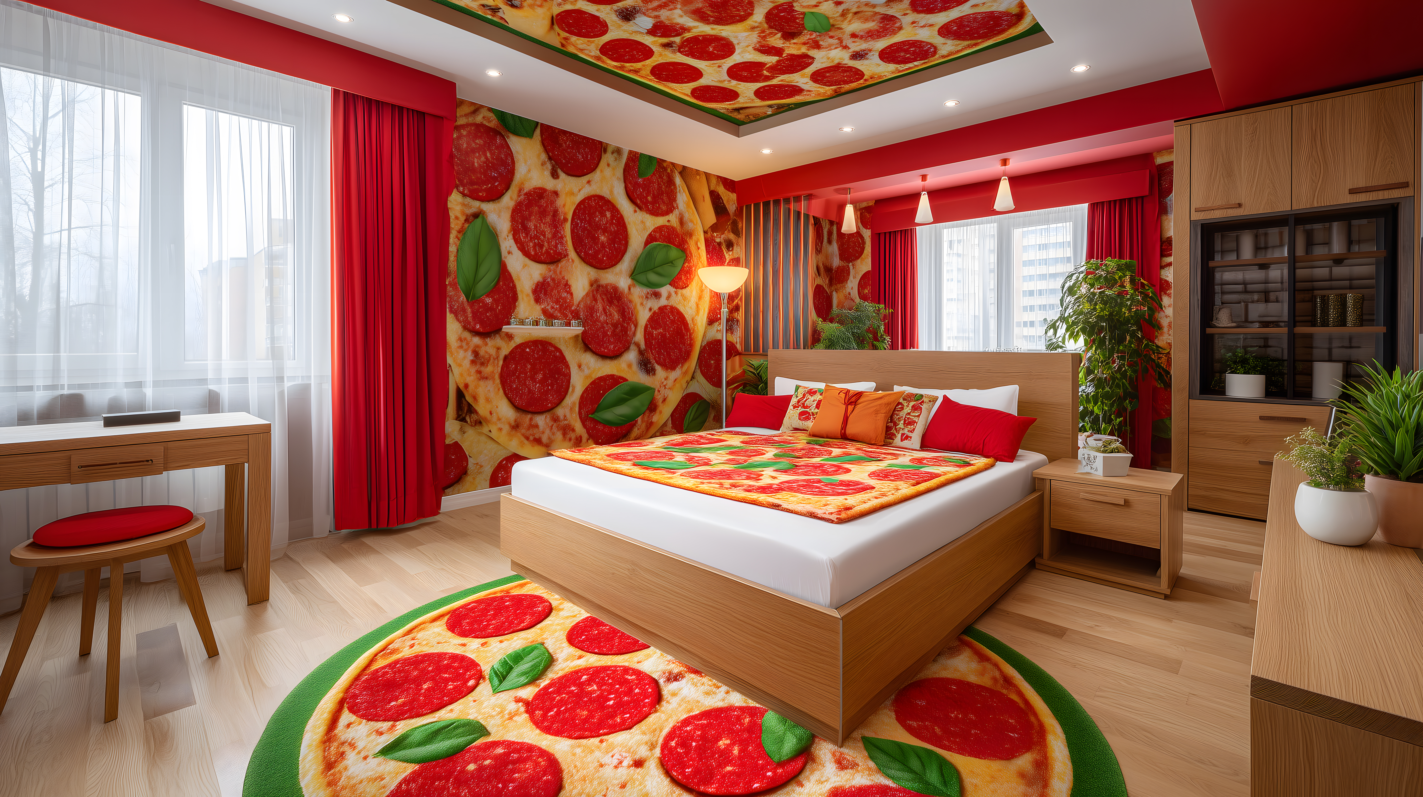 Dieses ungewöhnliche Schlafzimmer ist komplett im Pizza-Motiv-Design gestaltet. Der große Teppich, die Vorhänge und sogar die Decke zeigen große, bunte Pizzastücke. Das Bett ist in Holztönen gehalten, passend zum restlichen Mobiliar. Die Beleuchtung, Pflanzen und Accessoires runden das Gesamtbild ab. Dieses kreative und unkonventionelle Interieur-Motiv ist perfekt für Lifestyle-Blogs, Social-Media-Posts oder als Hintergrundmotiv in Werbematerialien geeignet. Als hochwertiges Stockfoto in lizenzfreier, kreativer Commons-Lizenz bietet es vielfältige Einsatzmöglichkeiten bei Redaktionen, Designern und Werbeprofis.