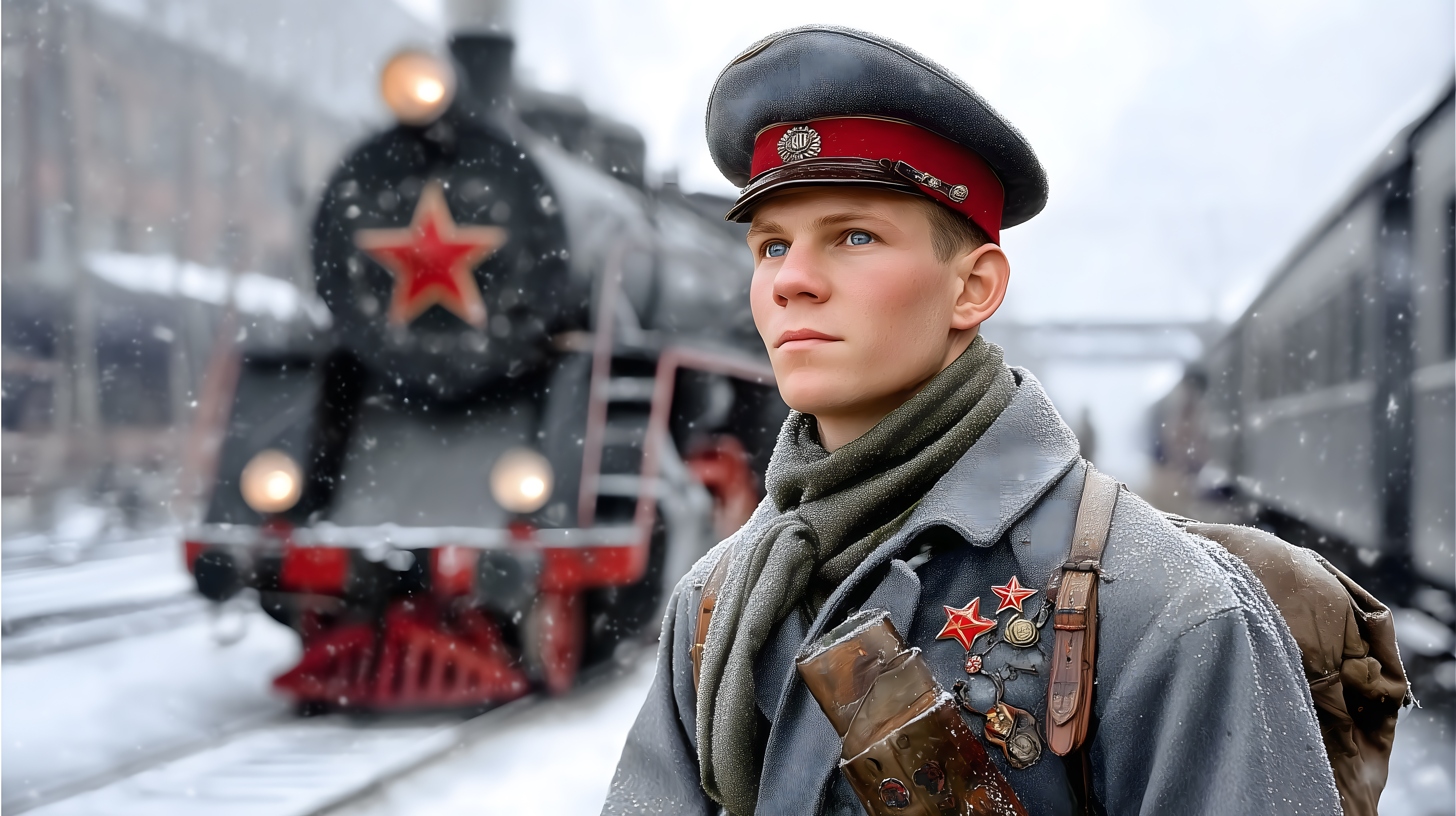 Dieses faszinierende Foto zeigt einen sowjetischen Soldaten in voller Uniform vor einem dampfenden Zug in einer verschneiten Winterlandschaft. Der junge Mann trägt eine charakteristische Mütze mit rotem Stern, der auf seine Herkunft aus der Sowjetunion hinweist. Im Hintergrund ist ein historischer Dampfzug zu sehen, dessen Lokomotive Dampf in die kalte Luft abgibt. Die Szenerie vermittelt einen Eindruck von Nostalgie und Retro-Atmosphäre, die ideal für Blogbeiträge, Newsletter-Designs oder Werbematerial geeignet ist. Dieses hochauflösende Stockfoto steht unter einer Creative-Commons-Lizenz zur freien Verwendung zur Verfügung.