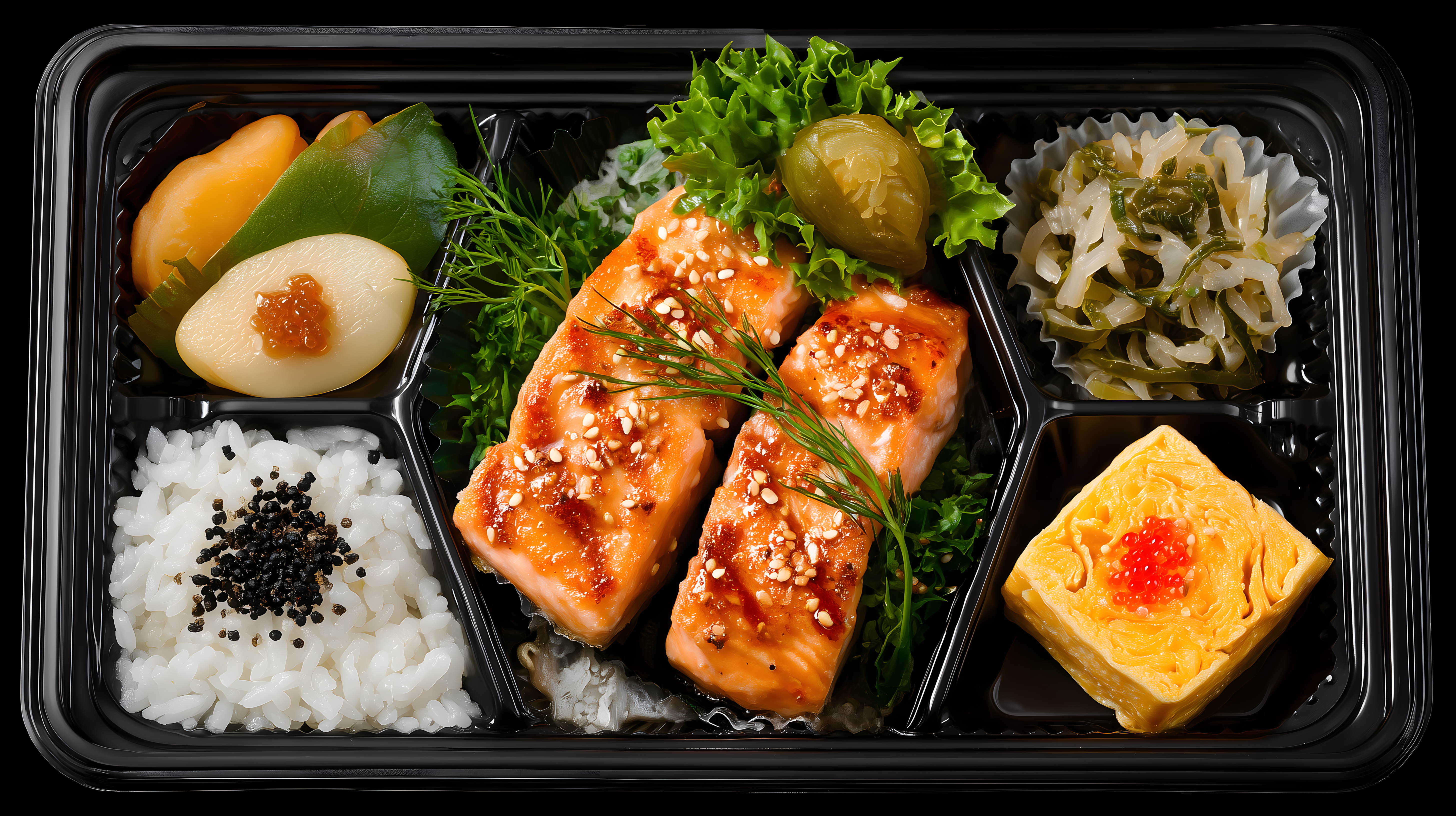 Dieses authentische japanische Bento-Box-Gericht zeigt eine abwechslungsreiche und ausgewogene Mahlzeit. Im Vordergrund sind leckere, glasierte Lachsstücke zu sehen, die mit Sesamsamen bestreut sind. Umgeben sind sie von frischem Salat, gelbem Tamagoyaki-Ei, Reis und eingelegtem Gemüse. Die Zutaten sind sorgfältig in einer schwarzen, rechteckigen Bento-Box angeordnet, die einen minimalistischen und stilvollen Rahmen bildet. Dieses Foto eignet sich hervorragend für Rezeptbeiträge, Kochblogs oder kulinarische Werbematerialien. Das hochauflösende Bild steht unter der Creative-Commons-Lizenz zur kostenlosen Verwendung zur Verfügung.