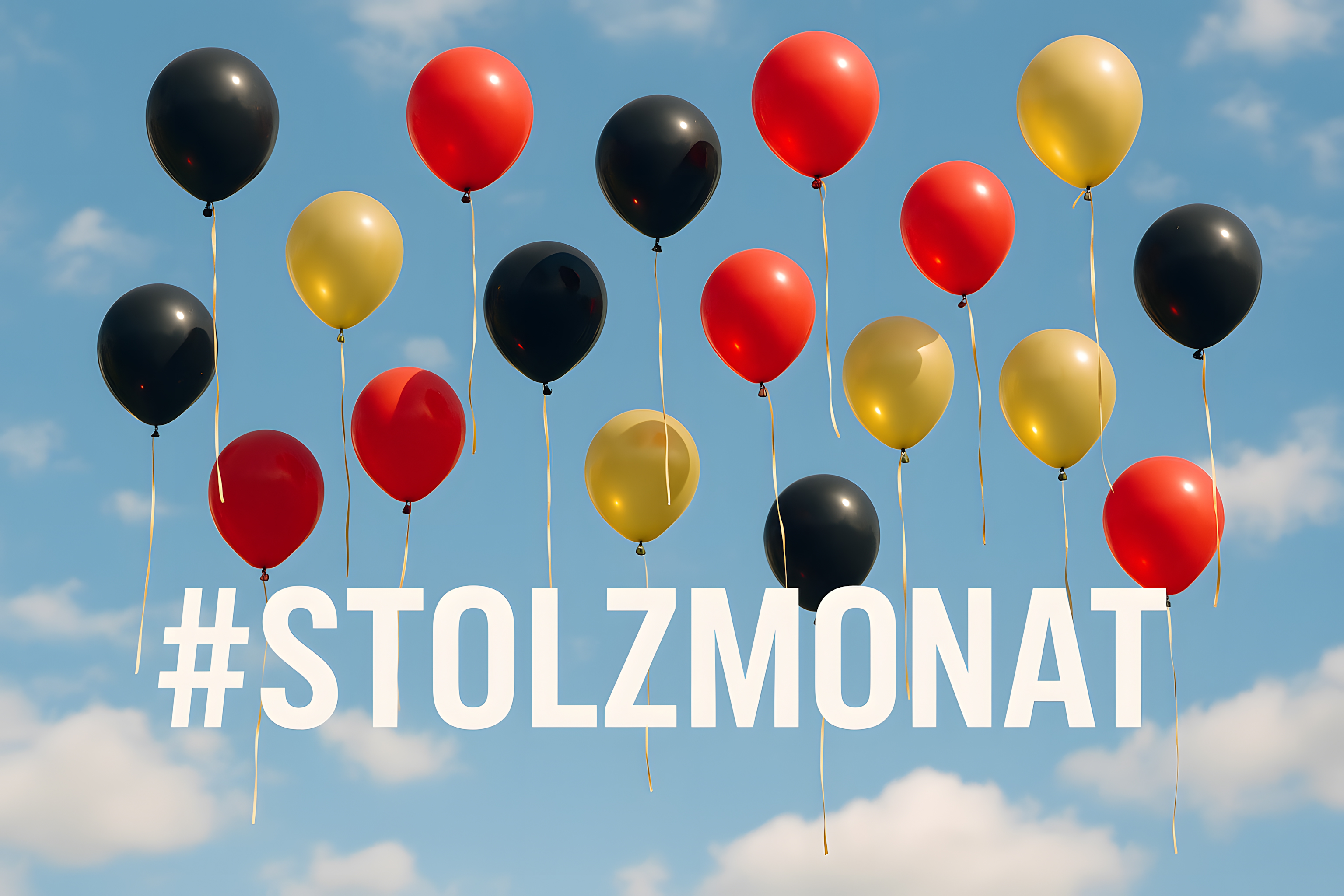 Dieses farbenfrohe Stockfoto zeigt eine Vielzahl von Luftballons in den Farben Schwarz, Rot und Gold vor einem strahlend blauen Himmel. Der Hashtag '#STOLZMONAT' ziert das Bild, was eine patriotische Stimmung vermittelt. Die Ballons sind in einer dynamischen, aufsteigenden Anordnung gruppiert, die eine Atmosphäre von Feierlichkeit und Freude ausstrahlt. Dieses Bild eignet sich hervorragend für Werbe- und Marketingzwecke, etwa für Blogs, Newsletter oder Social-Media-Kanäle. Es ist in hoher Auflösung und unter einer kostenlosen Creative-Commons-Lizenz verfügbar.