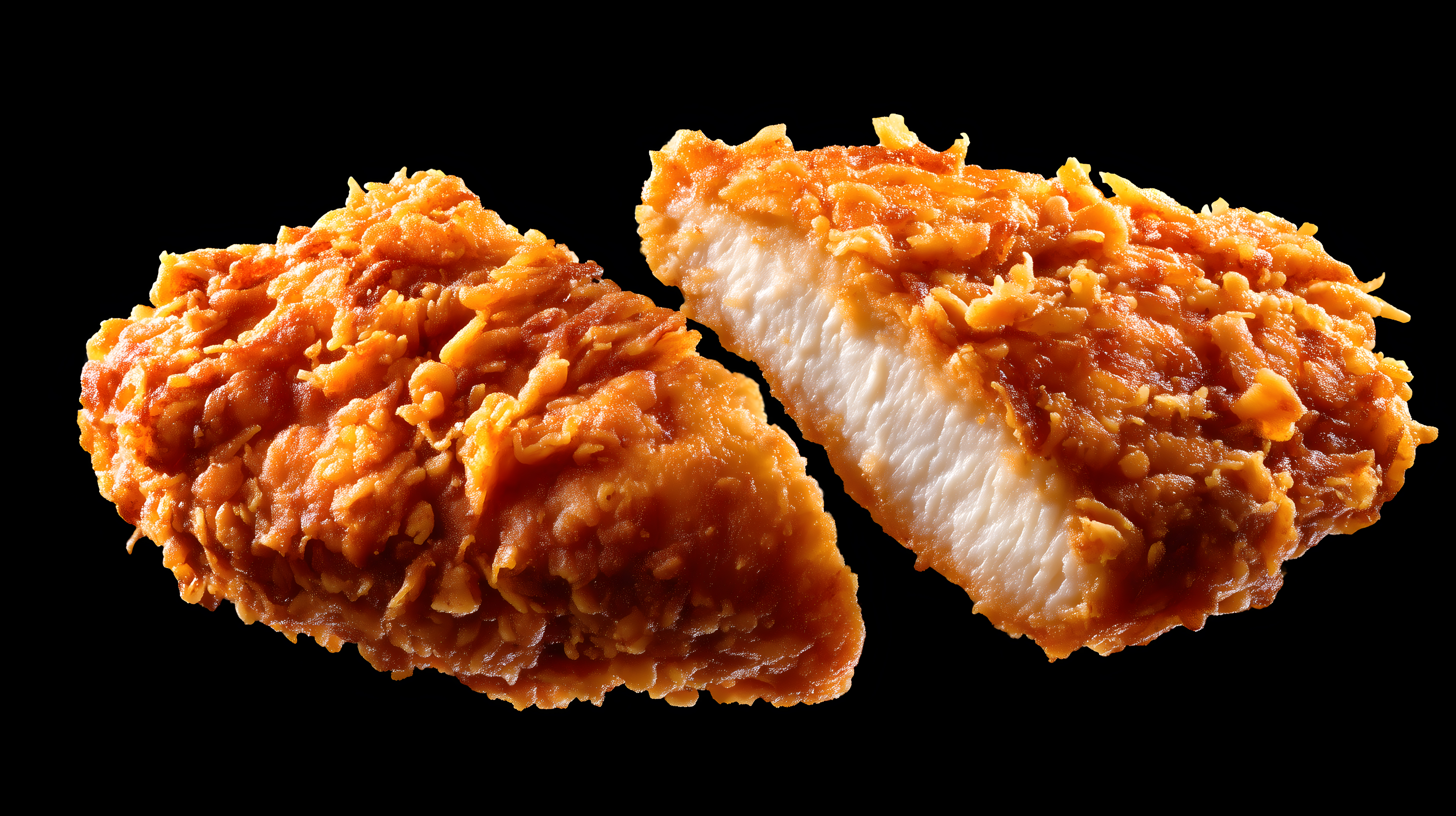 Das Bild zeigt zwei Stücke knuspriges, gebratenes Hähnchenfilet vor schwarzem Hintergrund in einer Nahaufnahme. Die Oberfläche der Stücke ist goldbraun und mit feinen Krusten überzogen, was auf eine perfekte Zubereitung hinweist. Dieses hochwertige Stockfoto eignet sich ideal für die Verwendung in Lebensmittelblogs, Kochrezepten, Restaurantwerbung oder Social-Media-Posts rund um Snacks und Gerichte mit Geflügel. In hoher Auflösung und unter der Creative-Commons-Lizenz frei verfügbar, lässt es sich vielseitig in digitalen Projekten einsetzen.