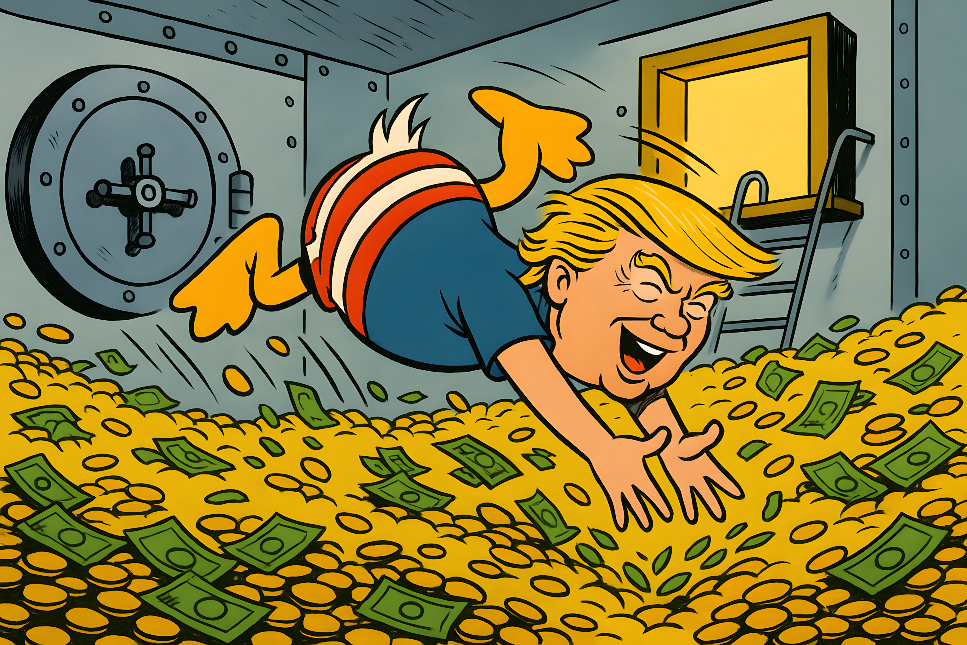 Das Bild zeigt eine überzeichnete, karikaturistische Darstellung eines reichen Mannes, der wie Dagobert Duck in einen Geldspeicher voller Münzen und Banknoten springt. Die Szene vermittelt visuelle Metaphern für Gier, Kapitalismus und Korruption. Der Protagonist erinnert an Donald Trump mit seiner auffälligen Frisur und Mimik. Das Bild wurde als satirische Illustration oder Werbegrafikvorlage konzipiert und eignet sich gut für den Einsatz in Blogs, Newslettern oder sozialen Medien zum Thema Finanzen, Wirtschaft oder politische Karikatur. Dieses hochauflösende, lizenzfreie Stockfoto steht unter Creative-Commons-Lizenz zur Verfügung.