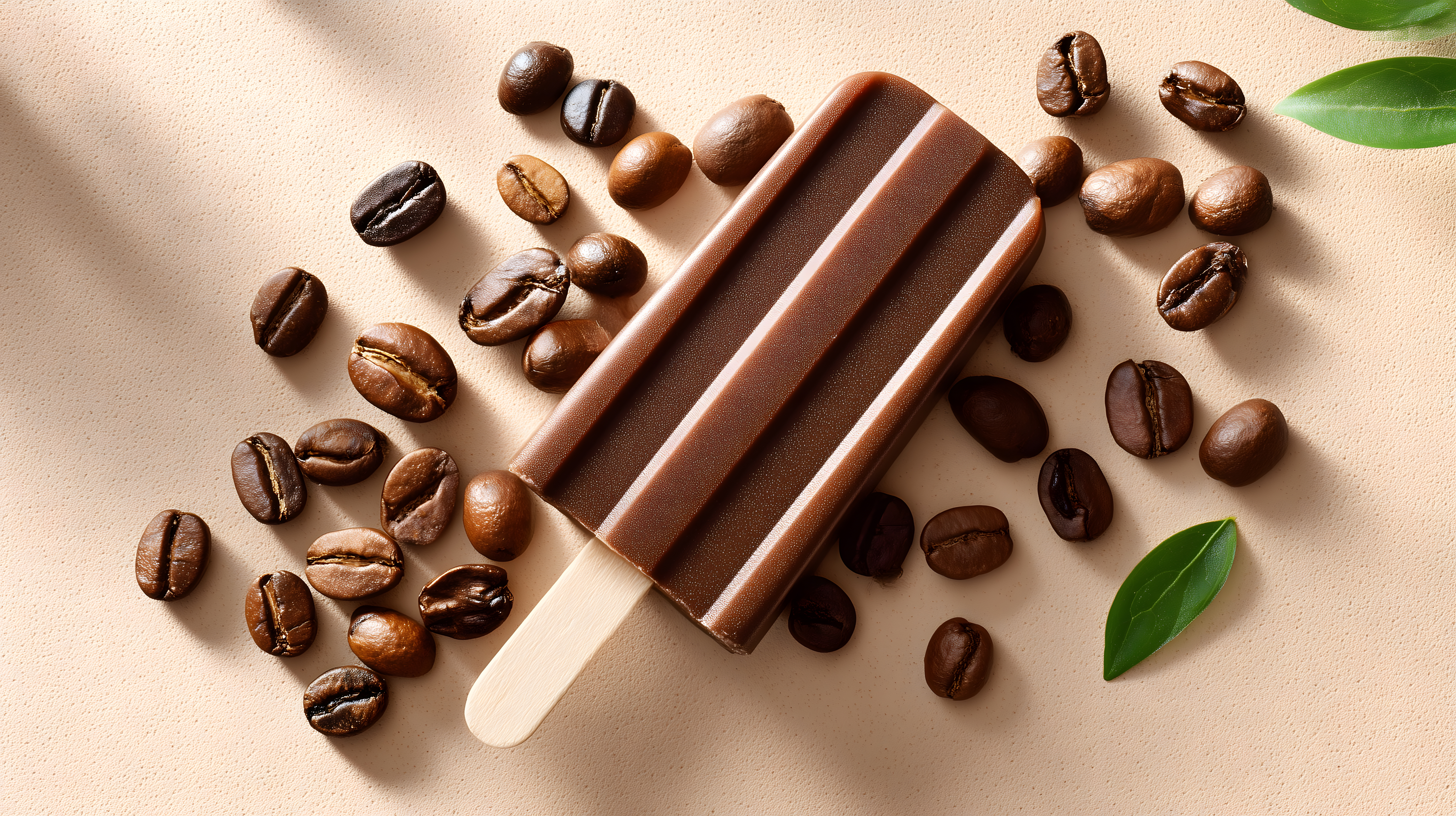 Das Bild zeigt ein köstliches Schokoladen-Eis am Stiel, das mit Kaffeebohnen dekoriert ist. Die Komposition ist stimmungsvoll und einladend, mit den braunen Kaffeebohnen und dem grünen Blatt, die sich farblich harmonisch vom hellbeigen Hintergrund abheben. Dieses Foto eignet sich hervorragend für den Einsatz in Blogs, Newslettern, Werbeanzeigen oder Social-Media-Kanälen. Es ist ein hochauflösendes, kostenloses Stockfoto unter einer Creative-Commons-Lizenz verfügbar.