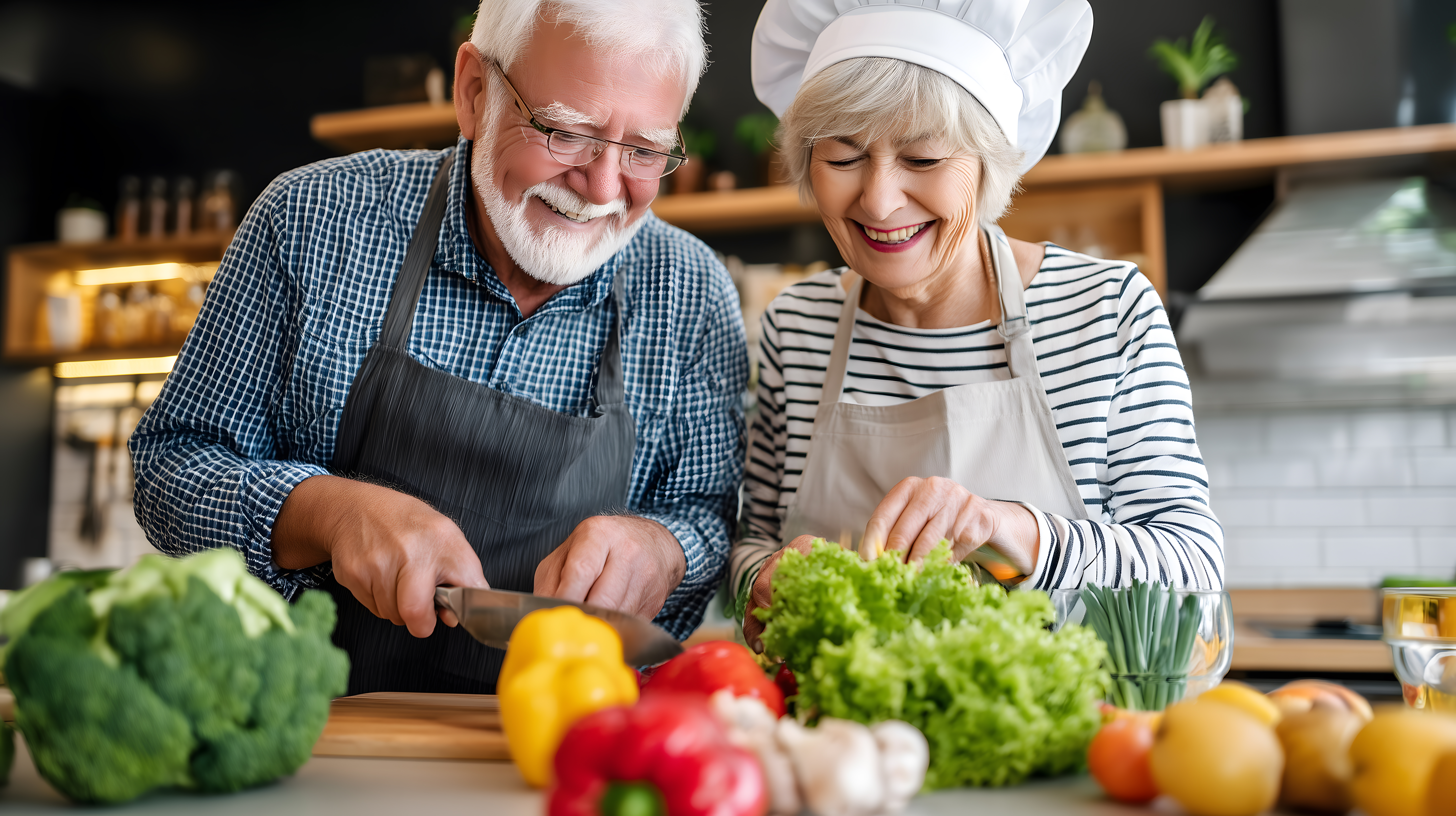 Das Bild zeigt ein älteres Paar, das gemeinsam in einer Küche Gemüse zubereitet. Der Mann und die Frau tragen Schürzen und lächeln glücklich, während sie frischen Salat, Paprika und andere Lebensmittel auf einem Holzbrett schneiden. Die helle, natürliche Beleuchtung und die gedeckten Farbtöne verleihen der Szene eine gemütliche, warme Atmosphäre. Dieses authentische Stockfoto eignet sich hervorragend für Blog-Beiträge, Newsletter oder Social-Media-Kanäle rund um gesunde Ernährung, Kochen im Alter, Rentnerkultur und Lebensfreude im Ruhestand. Das hochauflösende Bild ist kostenlos unter der Creative-Commons-Lizenz verfügbar.