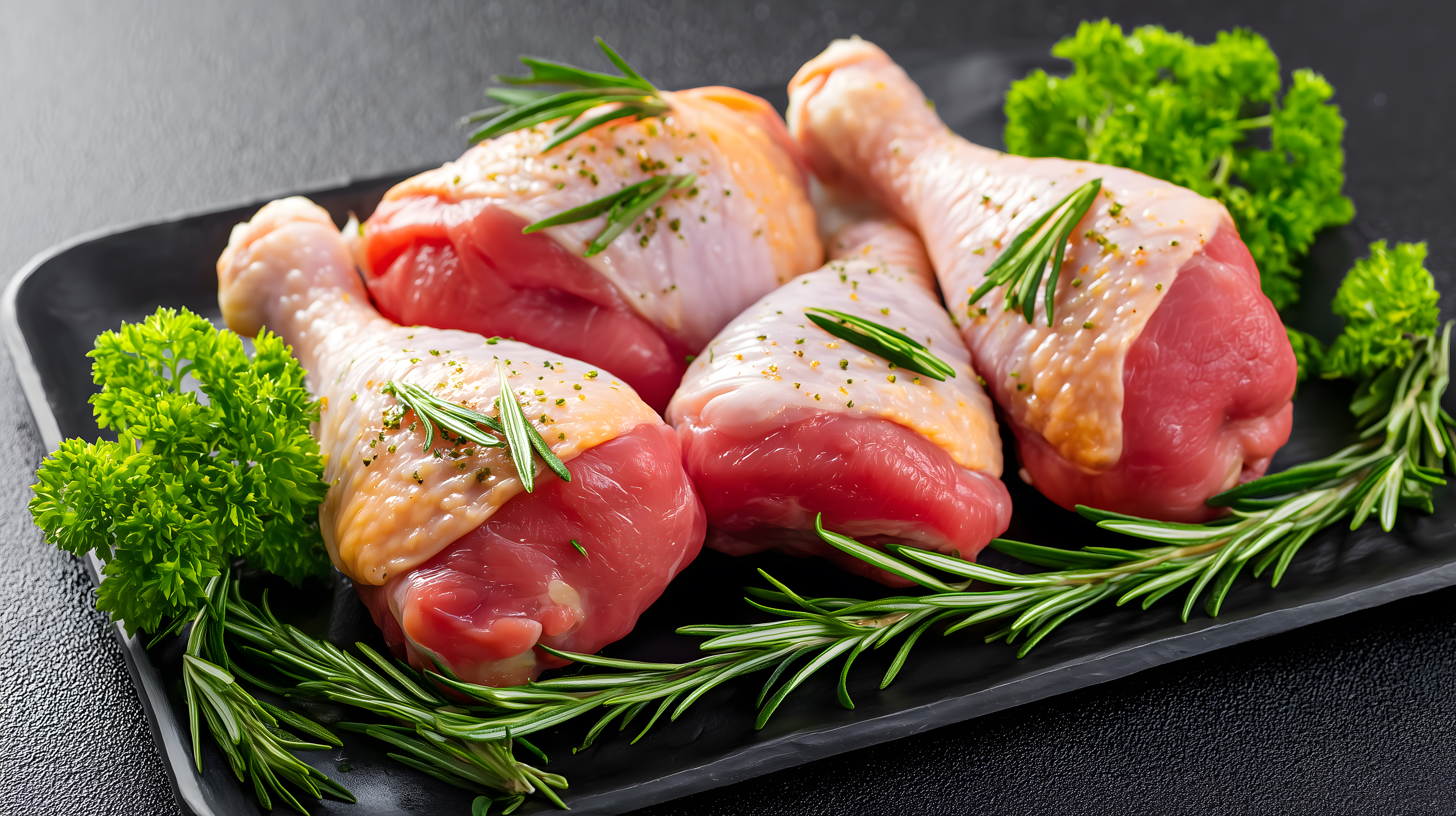 Dieses Foto zeigt saftige, rohe Hähnchenschenkel, die auf einem dunklen Untergrund angerichtet wurden. Die Hähnchenstücke sind mit frischen Kräutern wie Rosmarin und Petersilie dekoriert, was dem Bild einen appetitlichen und natürlichen Look verleiht. Die Farben und Kontraste sind sehr reizvoll und laden dazu ein, die Zutaten in einem leckeren Rezept zu verwenden. Das Foto eignet sich hervorragend als kostenloses Stockfoto für Kochbücher, Kochblogs, Werbung für Lebensmittel oder andere kulinarische Anwendungen. Die hochauflösende Darstellung und die Creative-Commons-Lizenz machen es zu einem äußerst flexibel einsetzbaren Bild.