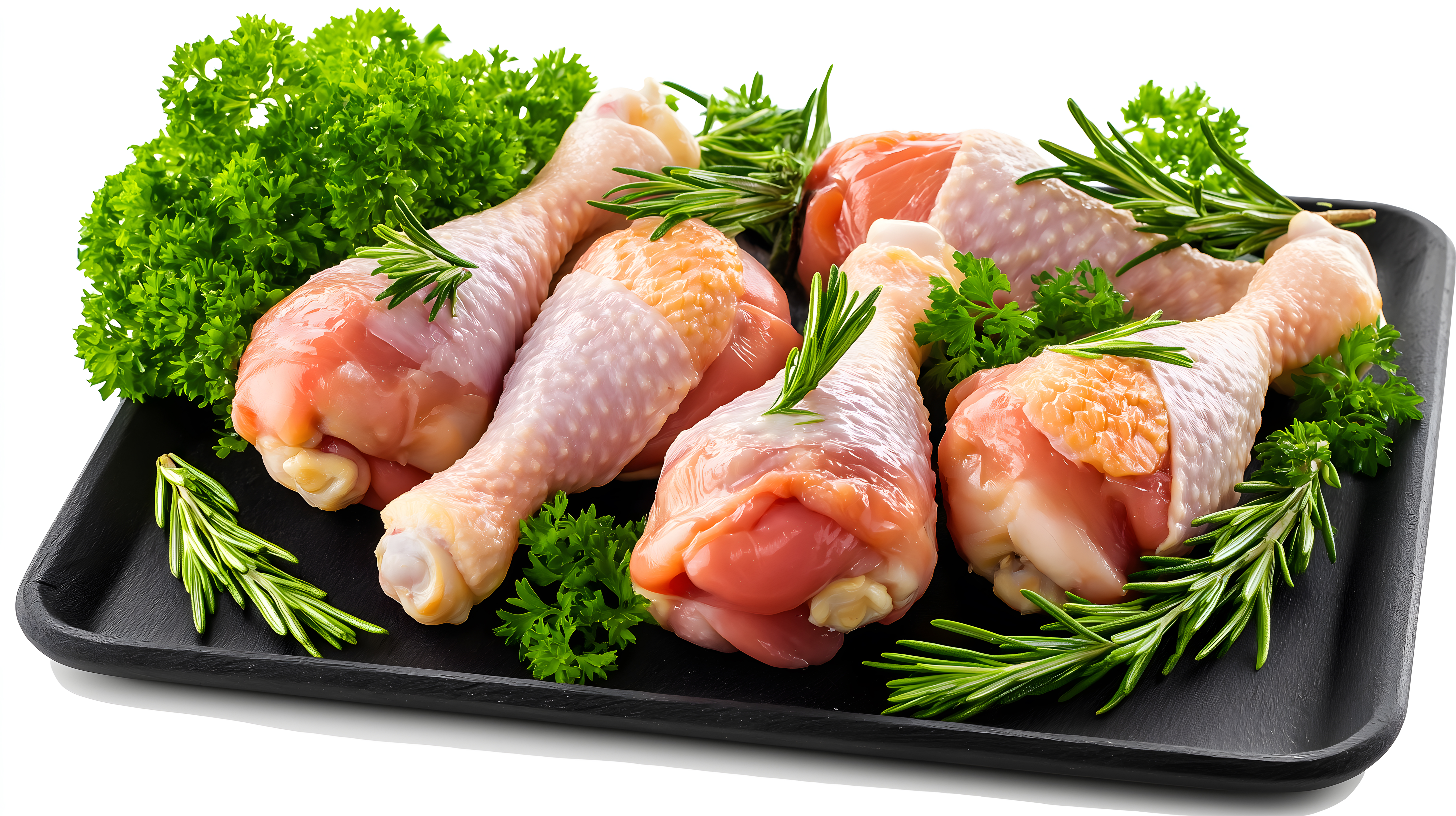 Dieses appetitliche Foto zeigt frische Hähnchenschenkel, die mit grünen Kräutern wie Petersilie und Rosmarin dekorativ auf einem schwarzen Tablett angerichtet sind. Die Fleischstücke haben eine schöne, natürliche Farbe und eine saftige Textur, die Lust auf ein köstliches Gericht macht. Das Bild eignet sich hervorragend als Stockfoto für Blogs, Newsletter, Social-Media-Posts oder Werbeanzeigen rund um Themen wie gesunde Ernährung, Kochen und Gastronomie. Es ist in hoher Auflösung und unter einer Creative-Commons-Lizenz verfügbar.