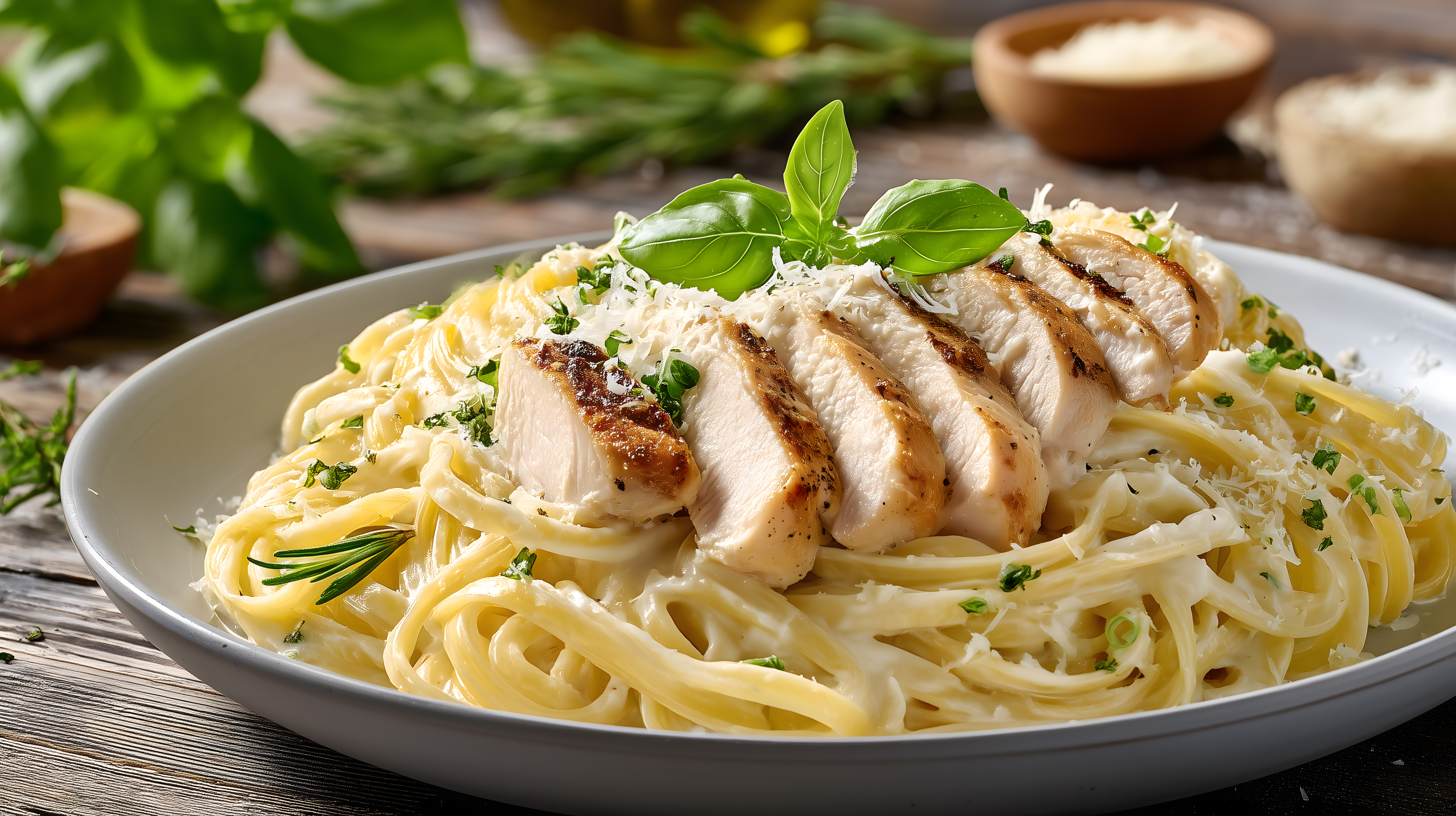 Dieses Foto zeigt eine appetitlich angerichtete Portion Fettuccine-Nudeln mit in Streifen geschnittener, marinierter und gegrillter Hähnchenbrust, einer cremigen Sahnesoße und frischen Basilikumblättern. Die Nudeln sind auf einem rustikalen Holztisch angerichtet, umgeben von weiteren Zutaten wie Parmesan, Weißwein und einer Zitronenscheibe. Das Bild vermittelt den Appetit anregenden Eindruck eines hochwertig zubereiteten italienischen Hauptgerichts, das sich hervorragend für Rezeptbeiträge, Restaurantmenüs oder Werbezwecke eignet. Als hochwertiges, kostenloses Stockfoto in hoher Auflösung unter einer Creative-Commons-Lizenz verfügbar, bietet es viele Einsatzmöglichkeiten für Blogs, Newsletter oder Social-Media-Kanäle.