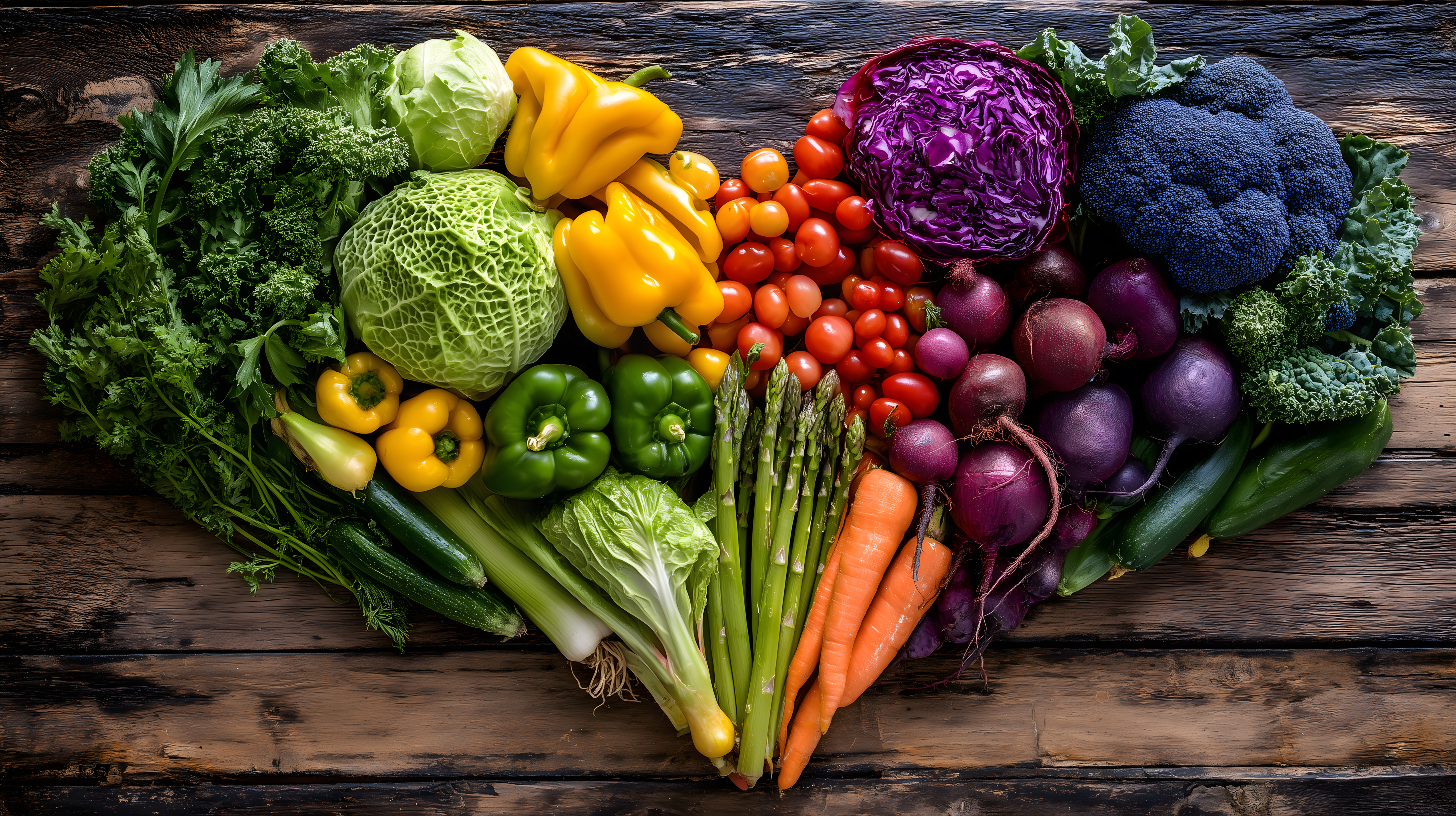 Dieses farbenprächtige Foto zeigt eine Vielzahl an frischem Gemüse, sorgfältig in Herzform angeordnet auf einem rustikalen Holztisch. Die Zusammenstellung umfasst grüne und violette Paprika, gelbe und orange Karotten, Brokkoli, Lauch, Tomaten, Rotkohl und weitere saftige Zutaten. Die gesunde Vielfalt an Farben, Formen und Texturen strahlt Frische, Vitalität und Natürlichkeit aus. Dieses hochauflösende Stockfoto eignet sich hervorragend für Verwendungen in Rezepten, Gesundheitsportalen, Blogbeiträgen zum Thema Ernährung oder Werbematerial für vegetarische und vegane Produkte.