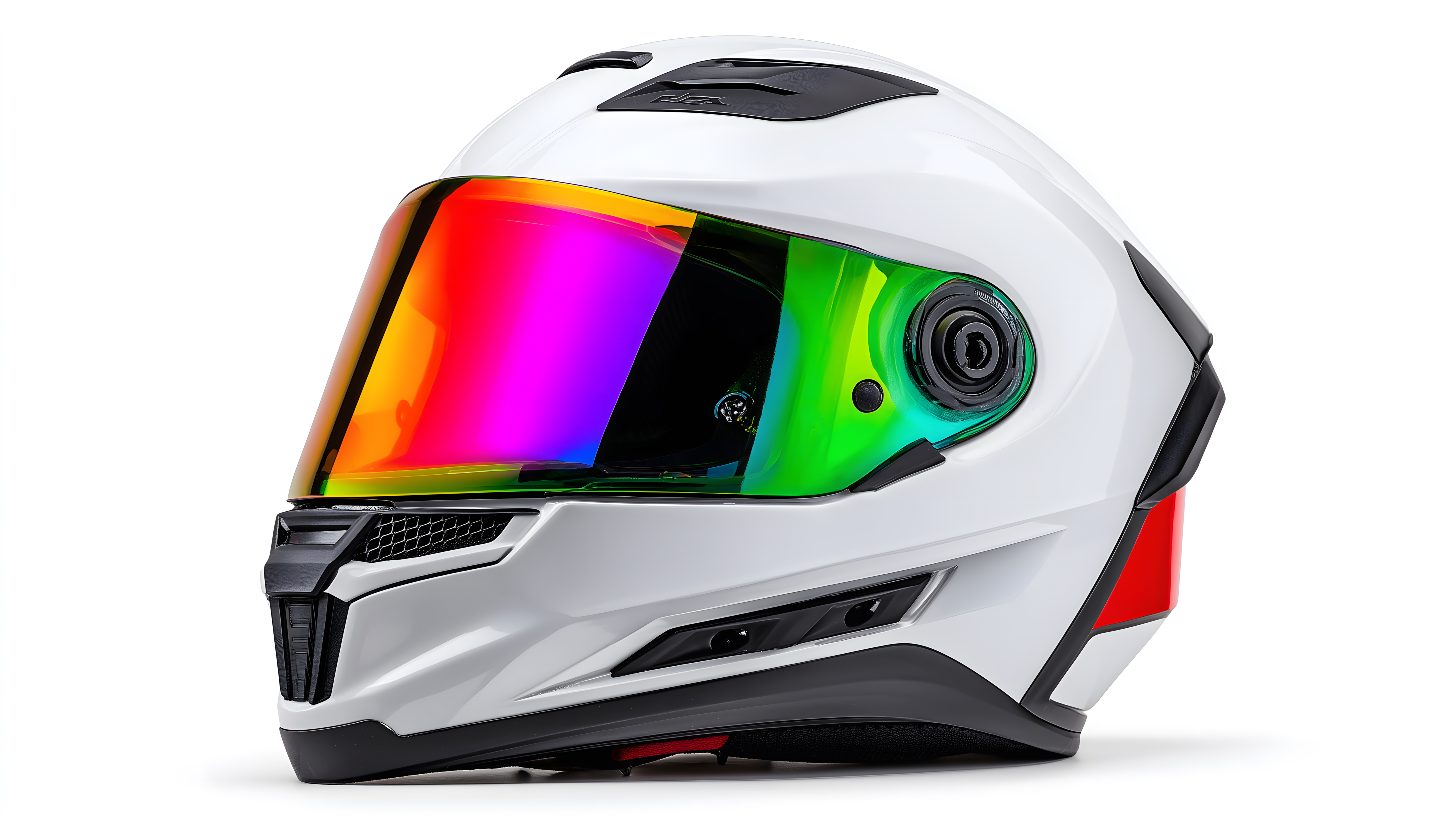Dieses Foto zeigt einen modernen, weißen Motorradschutzhelm mit einem auffälligen Regenbogenvisier. Der Helm hat eine aerodynamische Form und ist mit verschiedenen Lüftungsöffnungen und technischen Details ausgestattet, die auf eine hochwertige Qualität hinweisen. Das bunte Visier in Regenbogenfarben verleiht dem Helm ein modernes und innovatives Design, das die Aufmerksamkeit des Betrachters auf sich zieht. Dieses Stockfoto eignet sich hervorragend für den Einsatz in Blogs, Newslettern, Social-Media-Kampagnen oder Werbematerialien rund um das Thema Motorradfahren, Sicherheit und technologisches Design. Das Bild ist in hoher Auflösung verfügbar und unter einer Creative-Commons-Lizenz kostenfrei nutzbar.