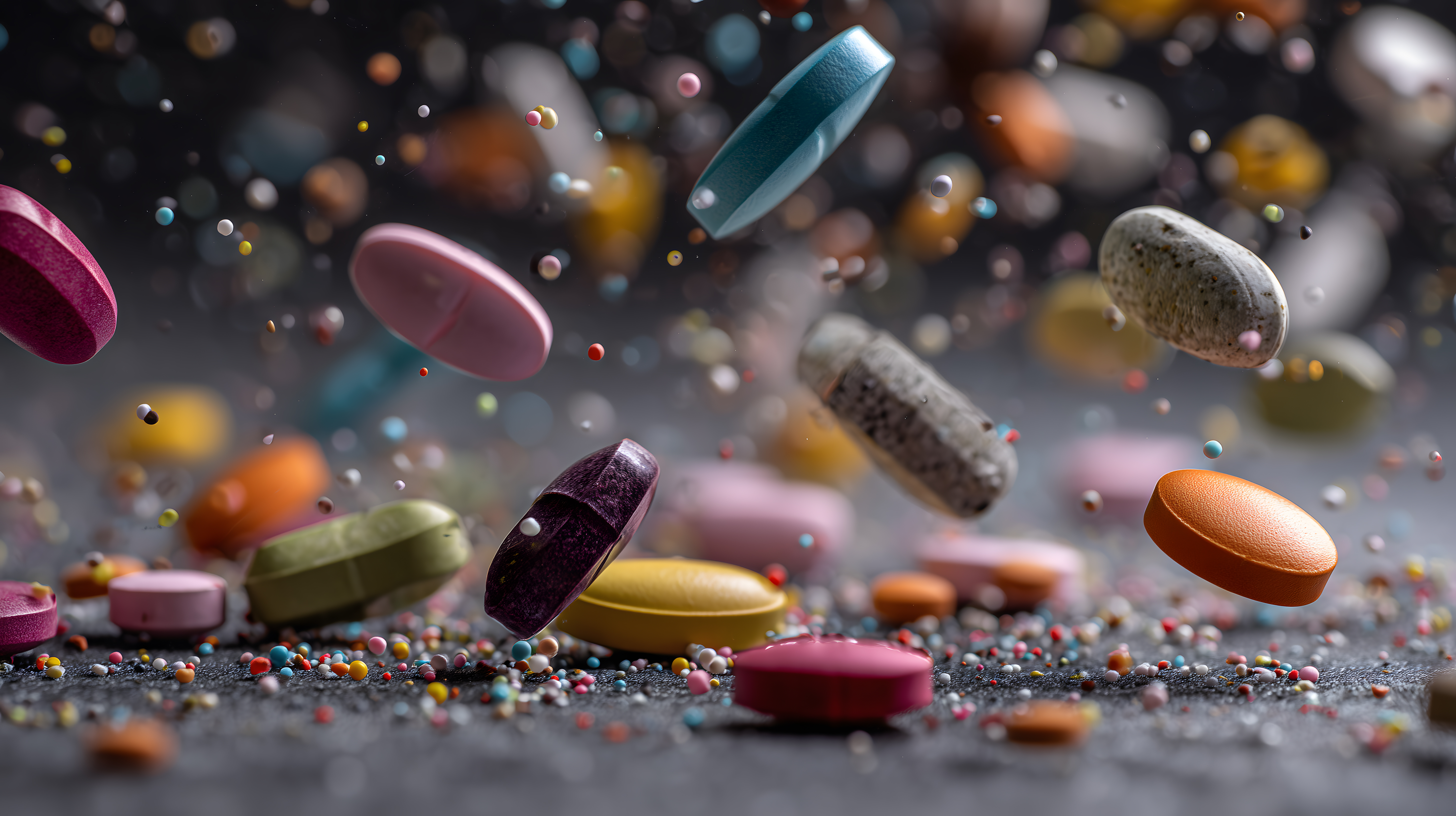 Dieses faszinierende Foto zeigt eine Ansammlung bunter Arzneimittel und Pillen, die durch die Luft schweben. Die vielfältigen Farben und Formen der Medikamente, die sich vor einem dunklen Hintergrund präsentieren, schaffen eine abstrakte und dynamische Komposition. Das Bild vermittelt einen Eindruck von Bewegung und Lebendigkeit und könnte ideal für die Verwendung in Werbe-, Marketing- oder Gesundheitsthemen eingesetzt werden. Dieses hochauflösende Stockfoto ist unter einer Creative-Commons-Lizenz frei verfügbar und kann für eine Vielzahl von Zwecken genutzt werden.