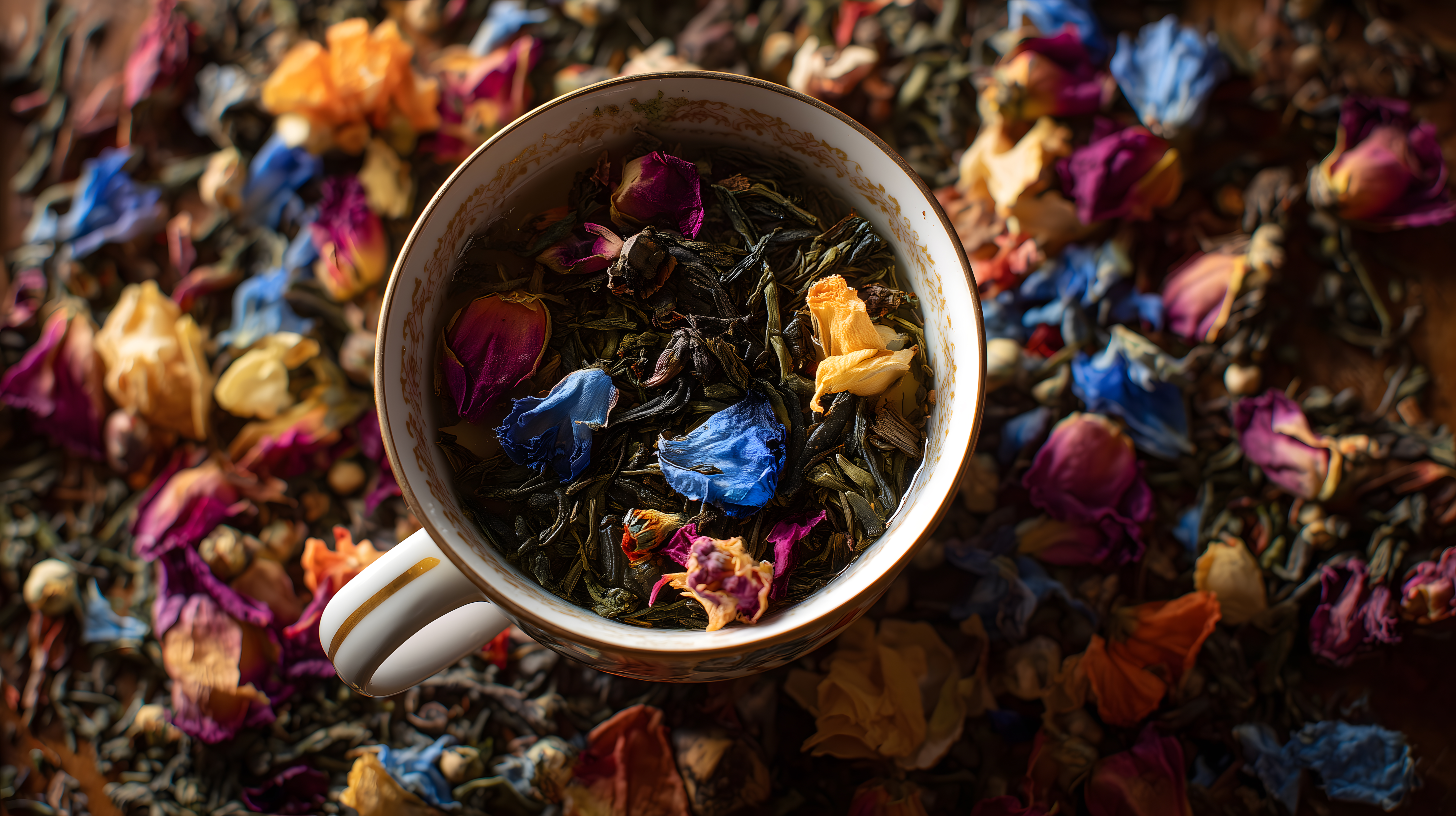 Das Bild zeigt eine Nahaufnahme einer Tasse mit einer bunten Teemischung. Die Tasse steht auf einem Untergrund aus Kräutern, Blüten und Teeblättern in verschiedenen Farben wie Lila, Blau, Orange und Rot. Die Zusammenstellung der Zutaten verleiht dem Getränk eine natürliche, rustikale Optik und vermittelt ein Gefühl von Entspannung und Wellness. Dieses hochwertige Stockfoto in hoher Auflösung eignet sich perfekt für Blogs, Newsletter, Social-Media-Beiträge oder Werbematerialien rund um Tee, Kräuter, Aromatherapie und gesunden Lebensstil. Es steht unter der Creative-Commons-Lizenz zur kostenlosen Verwendung zur Verfügung.