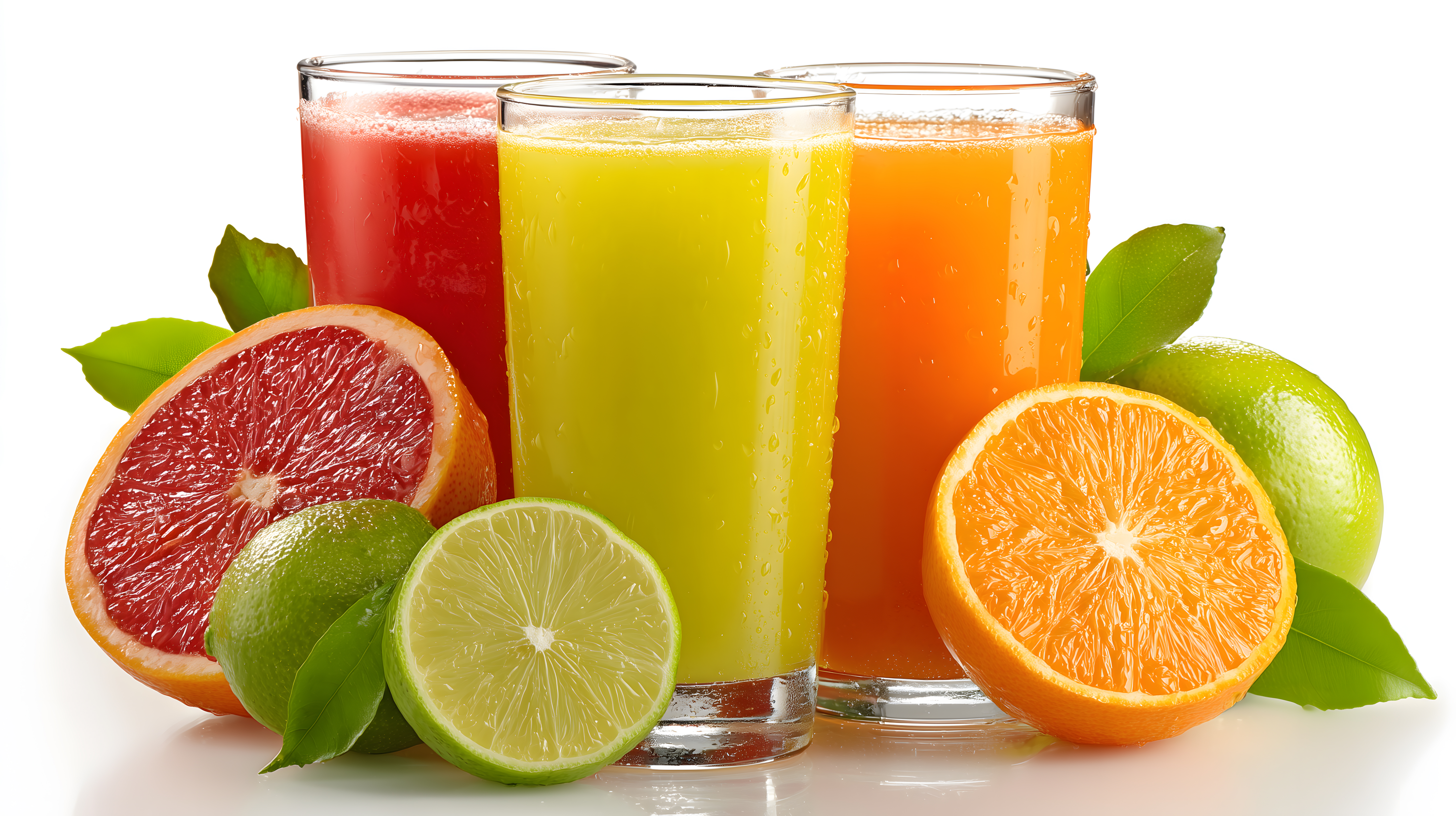 Dieses Bild zeigt eine Anordnung von frischen Zitrusfrüchten wie Orangen, Limetten und Grapefruits sowie drei Gläser gefüllt mit frisch gepressten, bunten Säften in Gelb, Orange und Rot. Die Früchte sind teilweise aufgeschnitten, um ihre frischen, saftigen Innereien zu enthüllen. Die Komposition legt den Fokus auf die leuchtenden Farben und die Frische der Produkte, die perfekt für die Verwendung in Werbung, Blogs, Social-Media-Posts oder anderen Kreationen geeignet sind. Dieses hochauflösende Stockfoto ist unter einer Creative-Commons-Lizenz frei nutzbar.