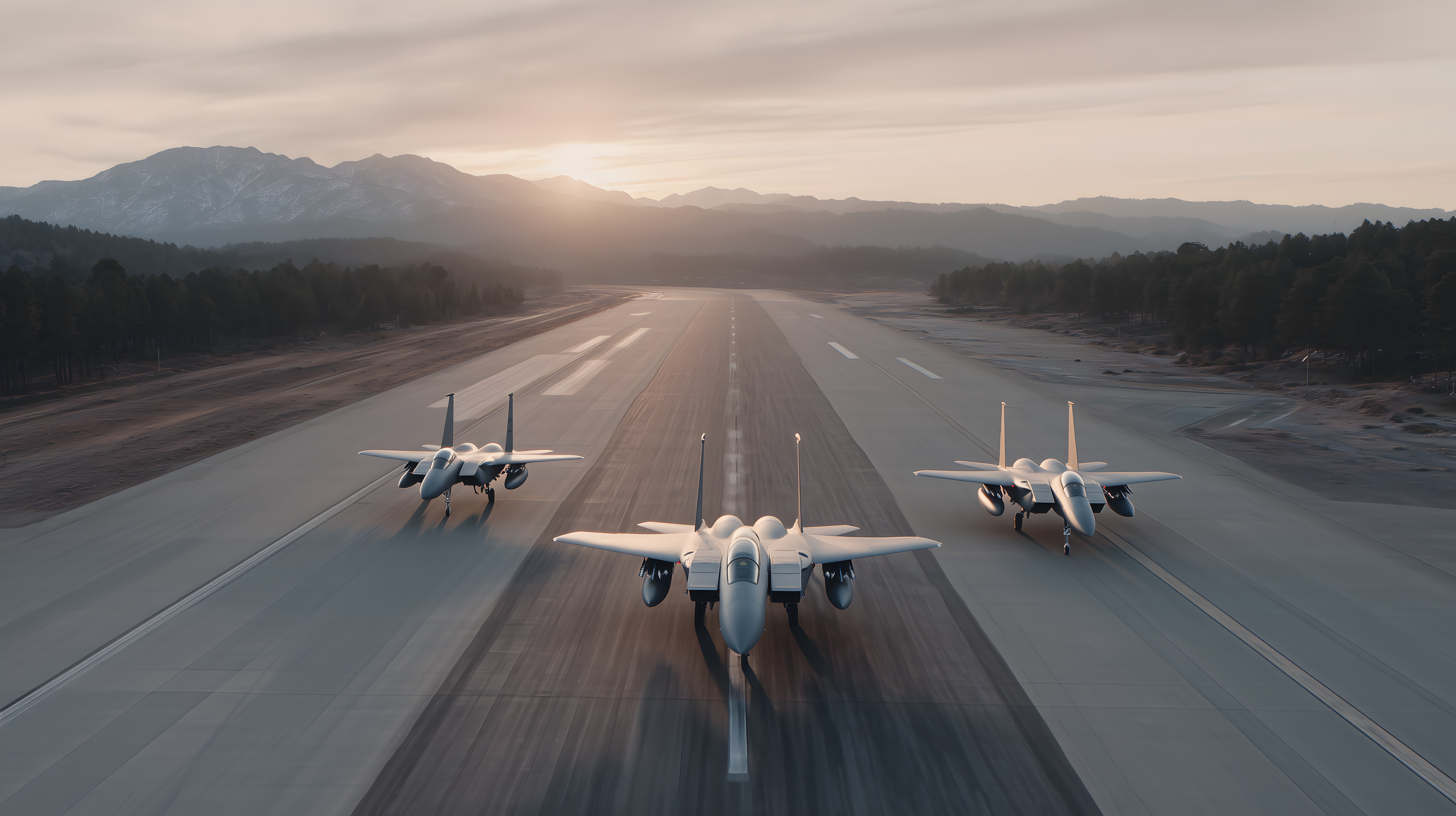 Dieses beeindruckende Foto zeigt eine Formation von drei Kampfflugzeugen, die über eine Startbahn fliegen, eingebettet in eine malerische Gebirgslandschaft bei Sonnenuntergang. Die Flugzeuge erscheinen wie schwebende Schatten, die sich mit hoher Geschwindigkeit über den Horizont bewegen. Ihre aerodynamische Form und die synchronisierten Flugmanöver vermitteln Kraft, Präzision und Kontrolle. Das Bild fängt die dramatische Stimmung und Freiheit des Fluges ein und eignet sich hervorragend für den Einsatz in Blogs, Newslettern, Social-Media-Kanälen oder Werbematerialien rund um Themen wie Luftfahrt, Militär oder Verteidigung. Dieses hochauflösende Foto steht unter der Creative-Commons-Lizenz und ist somit kostenfrei für Ihre Projekte nutzbar.