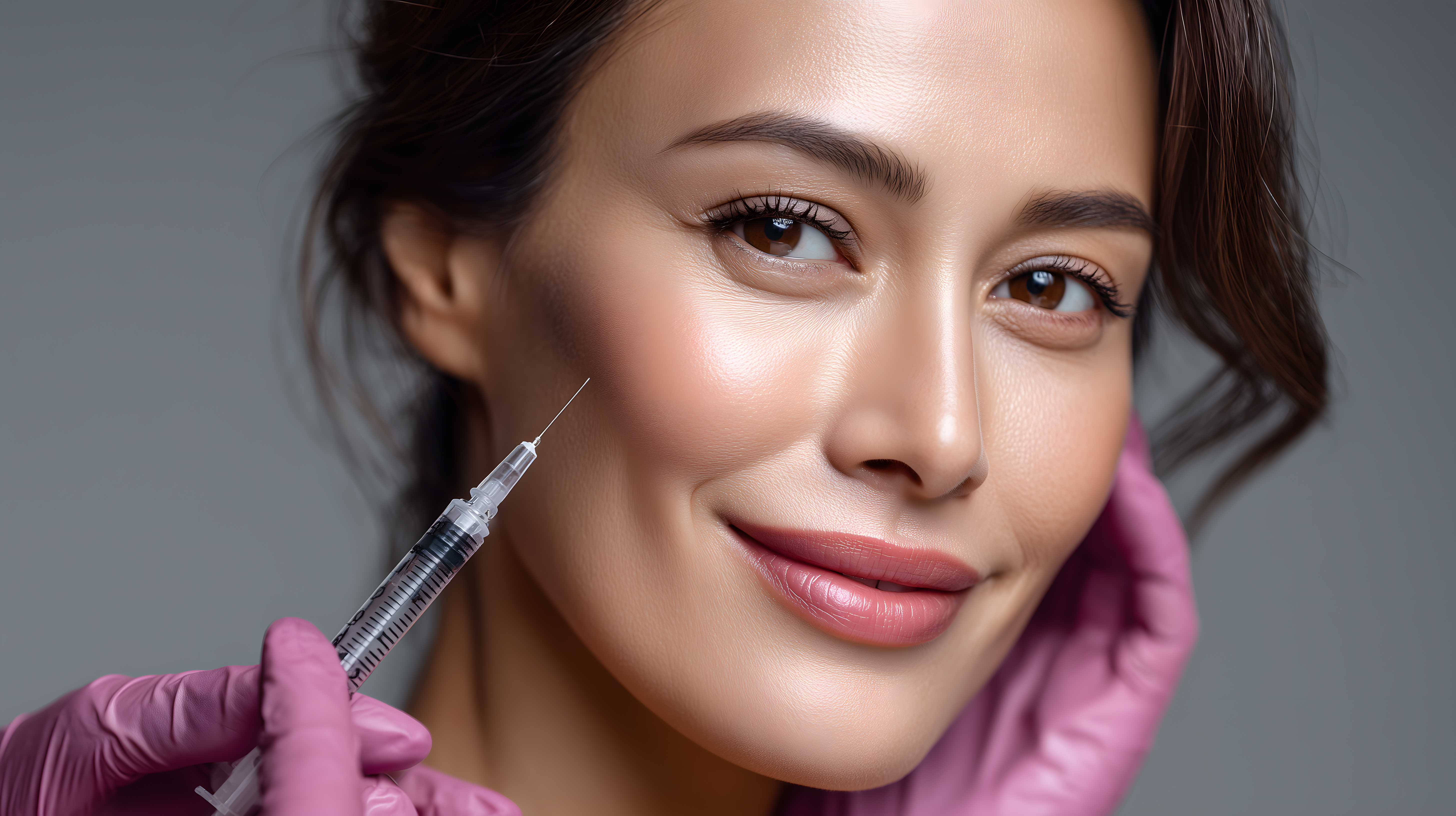 Das Bild zeigt eine Frau, die eine Schönheitsbehandlung mit einer Injektionsspritze erhält. Die Frau hat einen selbstbewussten und entspannten Gesichtsausdruck und trägt natürliches Make-up. Der Hintergrund ist grau, wodurch der Fokus ganz auf das Gesicht der Frau liegt. Dieses Stockfoto eignet sich gut für Beiträge in Blogs, Newslettern oder auf Social-Media-Kanälen, die sich mit Themen wie Gesundheit, Schönheit und Wellness beschäftigen. Das hochauflösende Bild ist unter einer Creative-Commons-Lizenz frei verfügbar.