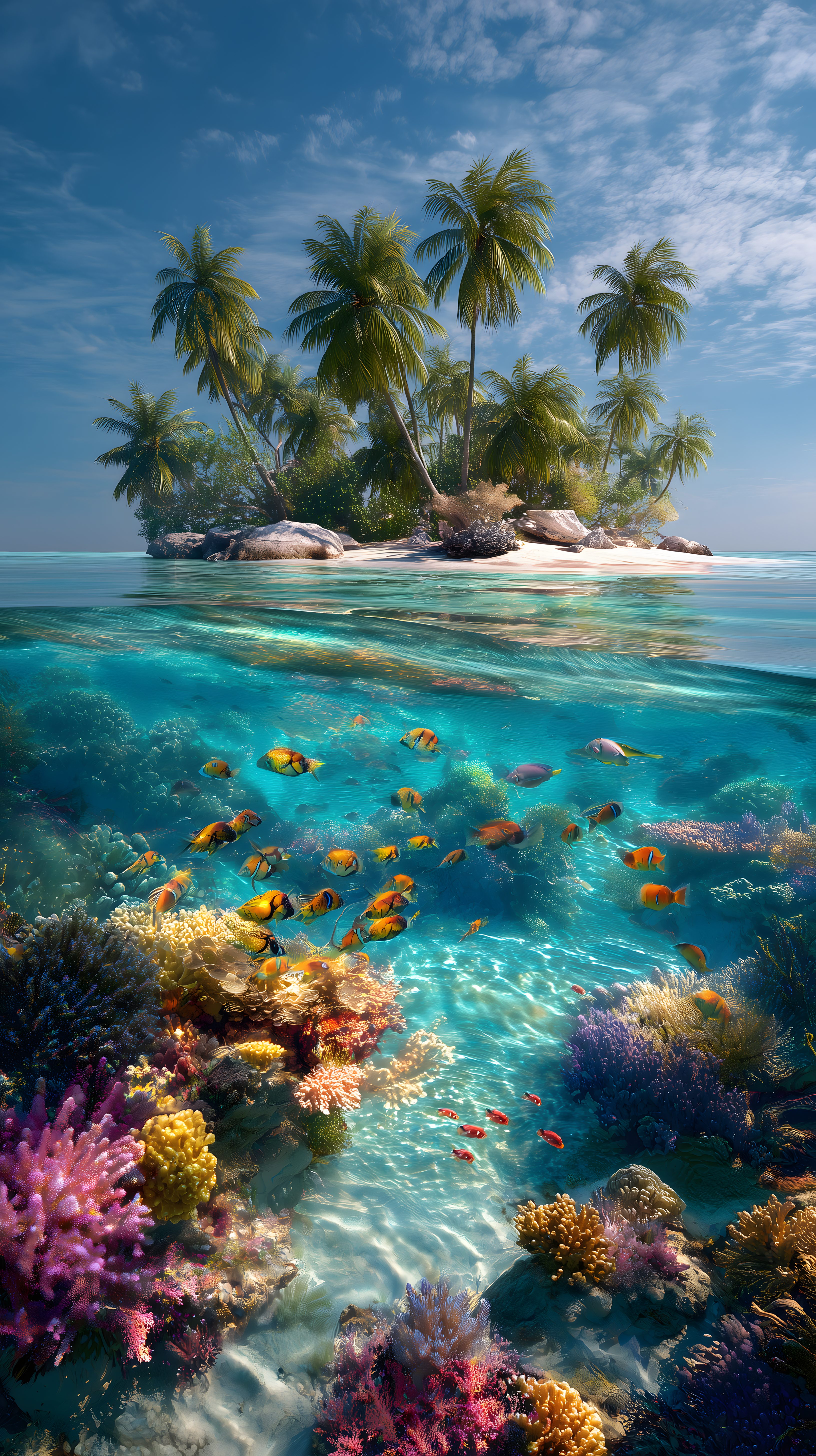 Dieses wunderschöne Foto zeigt eine tropische Insel mit üppiger Palmenvegetation, umgeben von einem kristallklaren, türkisfarbenen Meer. Unter der Wasseroberfläche erstreckt sich eine bunte Unterwasserwelt voller farbenfroher Korallen und Fische. Die Szenerie vermittelt ein Gefühl von Entspannung und Fernweh und eignet sich hervorragend als kostenloses Stockfoto für Blogs, Newsletter, Social-Media-Kanäle oder Werbematerialien. Das hochauflösende Bild ist unter einer Creative-Commons-Lizenz frei verwendbar.