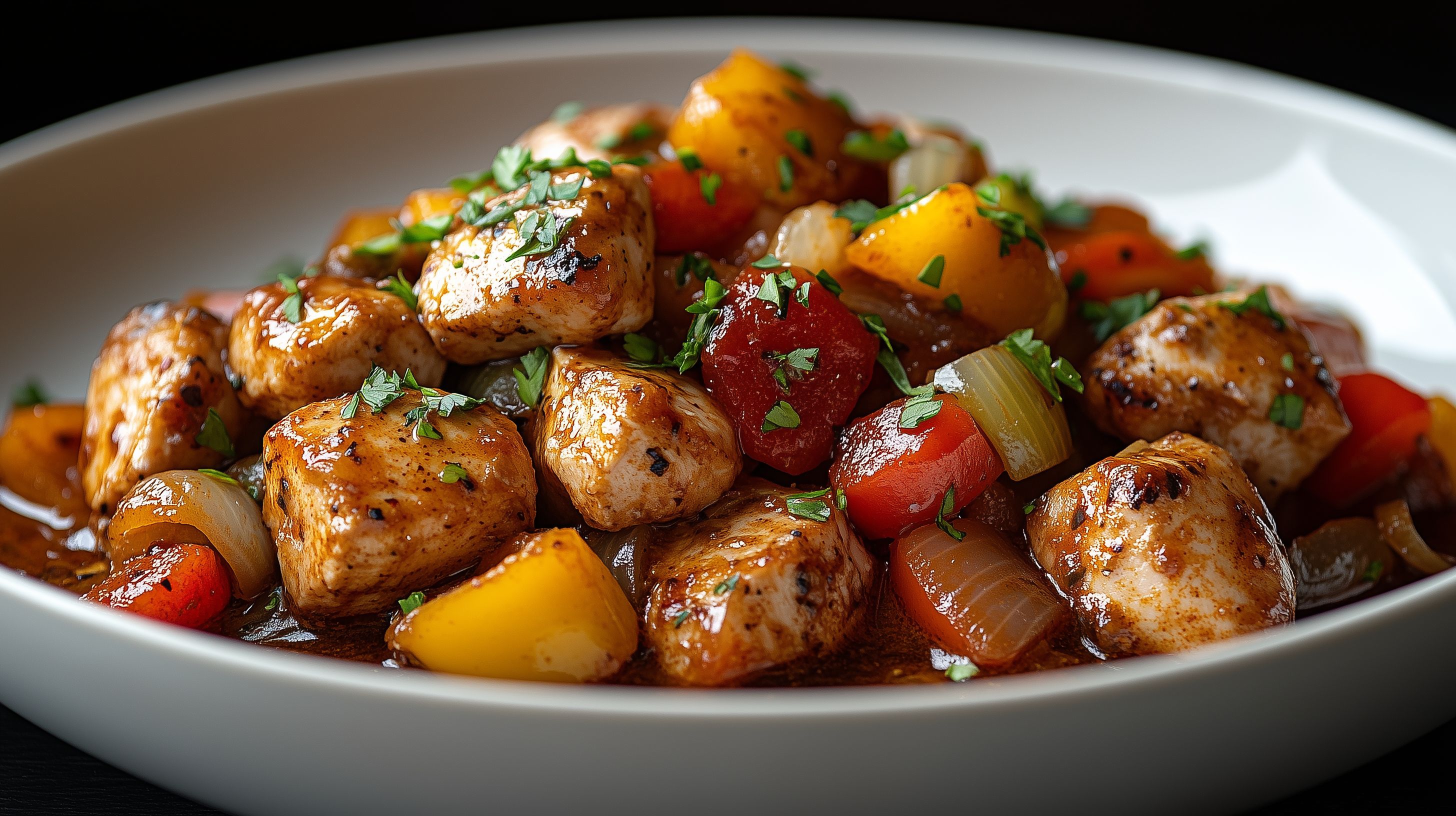 Dieses Foto zeigt ein köstliches Hühnchen-Gemüse-Gericht, das in einer rustikalen Schüssel serviert wird. Die Hauptzutaten sind Hühnchenwürfel, Paprika, Kartoffeln und verschiedene Kräuter. Das Gericht sieht nicht nur appetitlich aus, sondern bietet auch eine gesunde und ausgewogene Mahlzeit. Die Farbgebung ist sehr stimmungsvoll und natürlich, was auf den ersten Blick Appetit macht. Dieses Foto eignet sich ideal für die Verwendung in Blogs, Newslettern oder Social-Media-Beiträgen, um den Appetit der Betrachter anzuregen. Als hochwertiges, kostenloses Stockfoto unter Creative-Commons-Lizenz kann es frei genutzt werden.