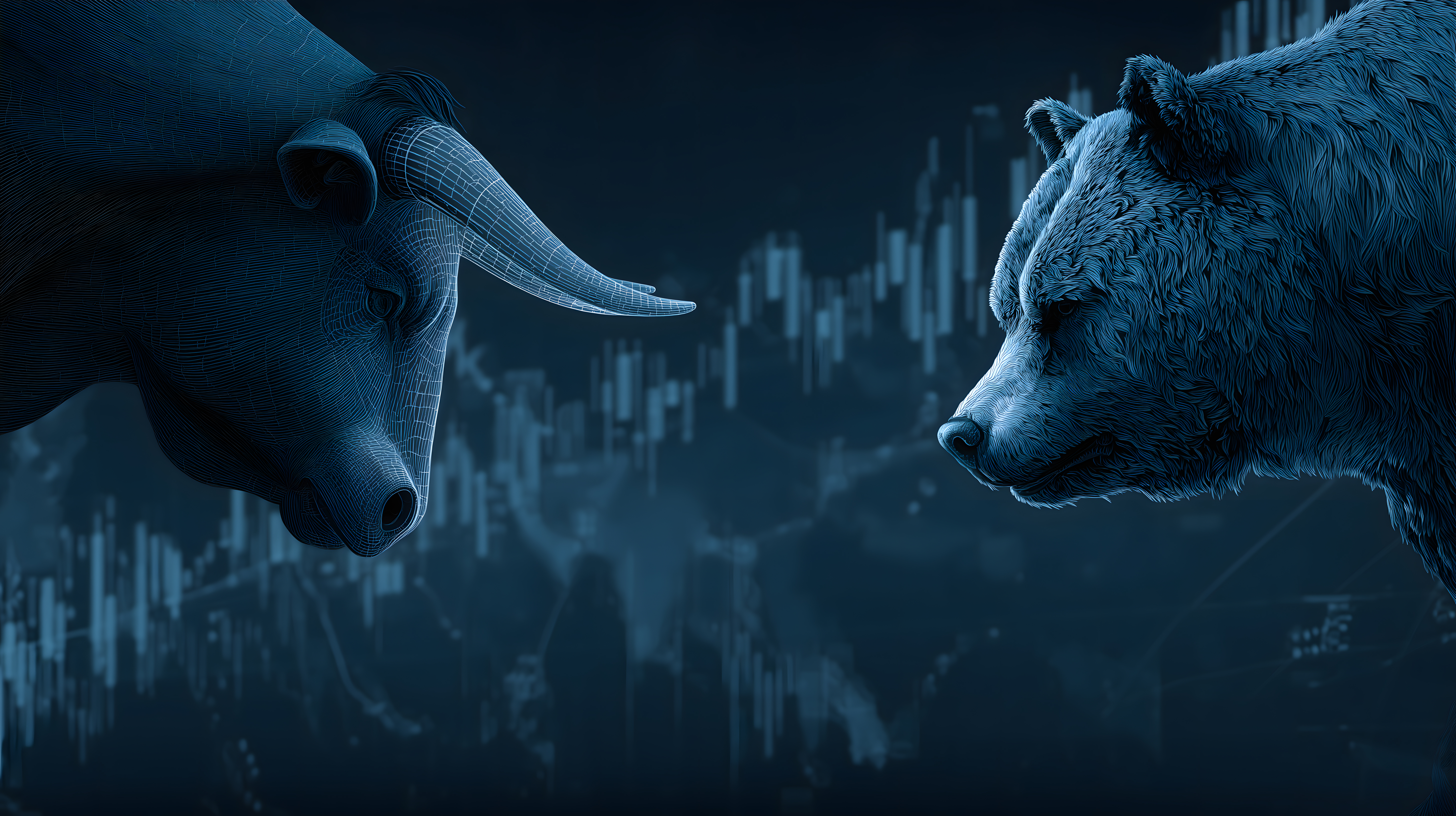 Das digitale Bild zeigt einen Bullen und einen Bären, die sich einem Finanzchart gegenüberstehen. Die düstere, bedrohliche Stimmung vermittelt den Eindruck einer angespannten Finanzmarktlage. Die technische Illustration im Computergraphikstil lässt auf eine digitale Finanzsoftware oder Börsensimulation schließen.