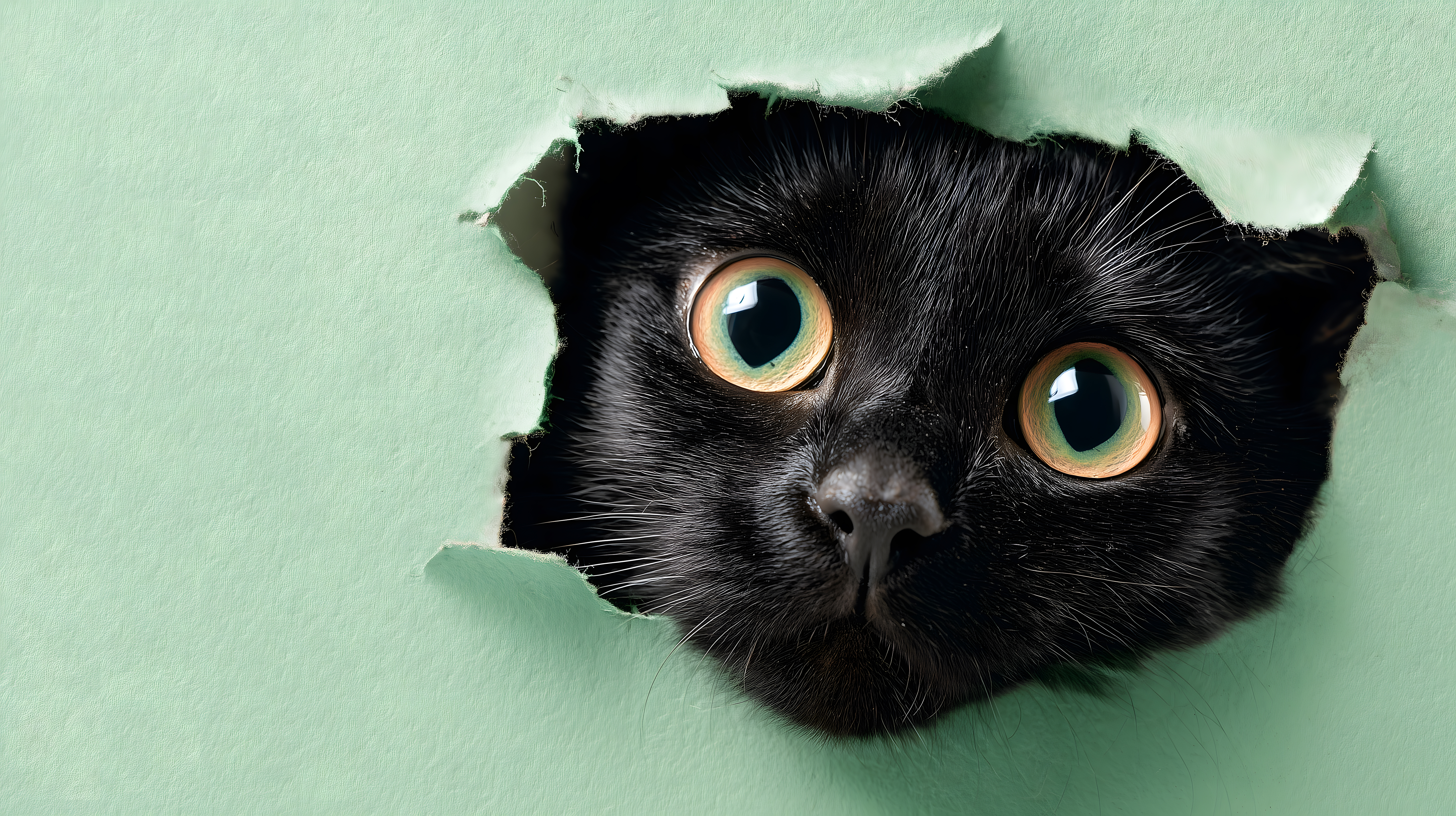 Das Foto zeigt den Kopf einer neugierigen schwarzen Katze, die durch ein Loch in einem grünen Papier oder einer Pappe blickt. Die Katze hat große, aufmerksame Augen und eine schwarze Schnauze, die nur teilweise durch das Papierloch zu sehen ist. Das Bild hat einen klaren Fokus auf den Katzenblick und vermittelt eine spielerische, charmante Stimmung.