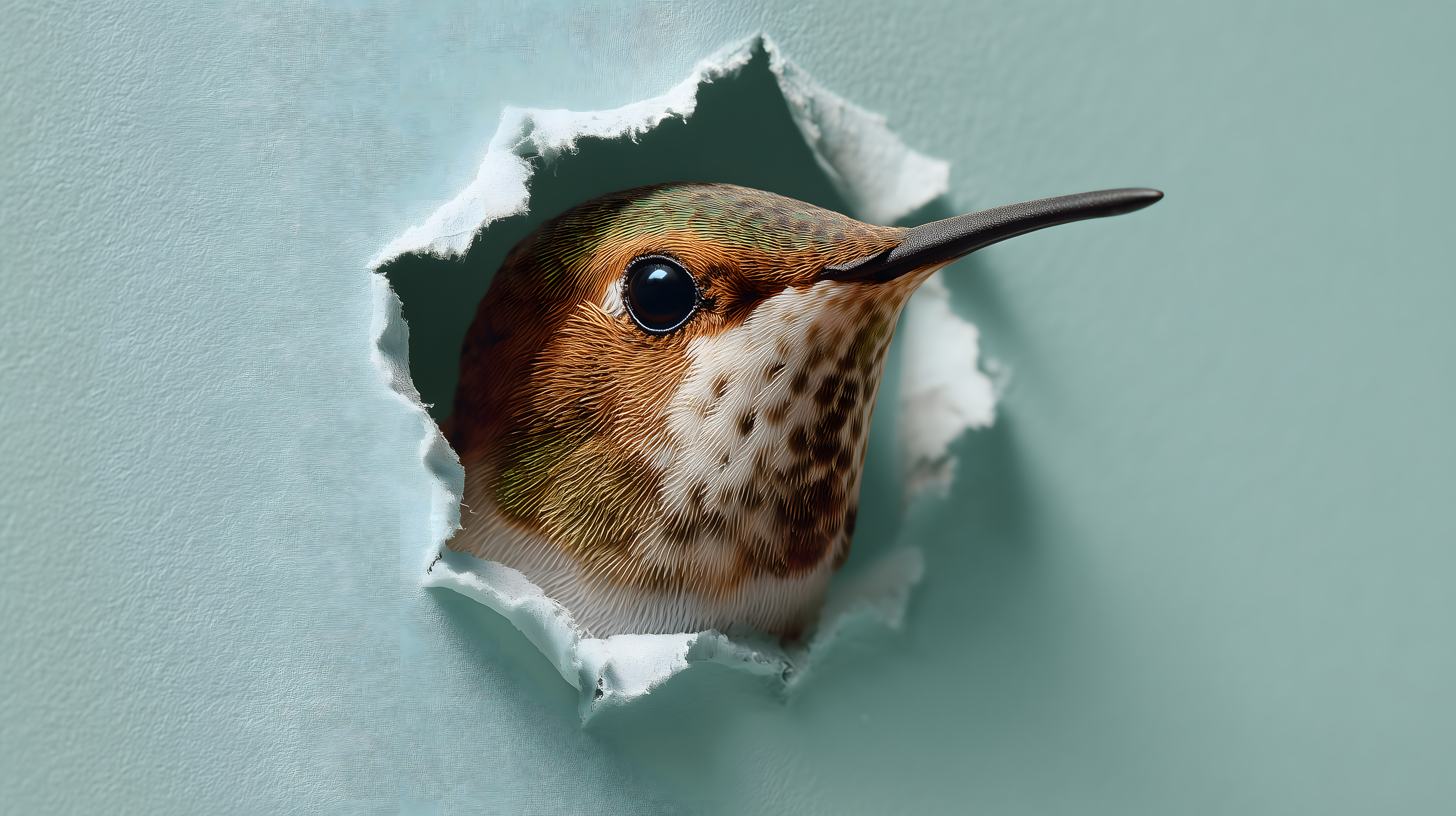 Das faszinierende Bild zeigt einen neugierigen Kolibri, der durch ein Papierloch blickt. Die detailreiche Nahaufnahme des Vogelkopfes offenbart ein wunderschönes, buntes Federkleid in Braun-, Gelb- und Orangetönen. Der Kontrast des Kolibris vor dem matten, türkisfarbenen Hintergrund erzeugt eine einzigartige, kunstvolle Ästhetik. Dieses kostenlose Stockfoto in hoher Auflösung eignet sich hervorragend für den Einsatz in Blogs, Newslettern, Social-Media-Beiträgen oder Werbekampagnen, die eine natürliche, kreative Stimmung vermitteln möchten. Die Veröffentlichung unter der Creative-Commons-Lizenz ermöglicht die einfache, rechtssichere Verwendung in Ihren Projekten.