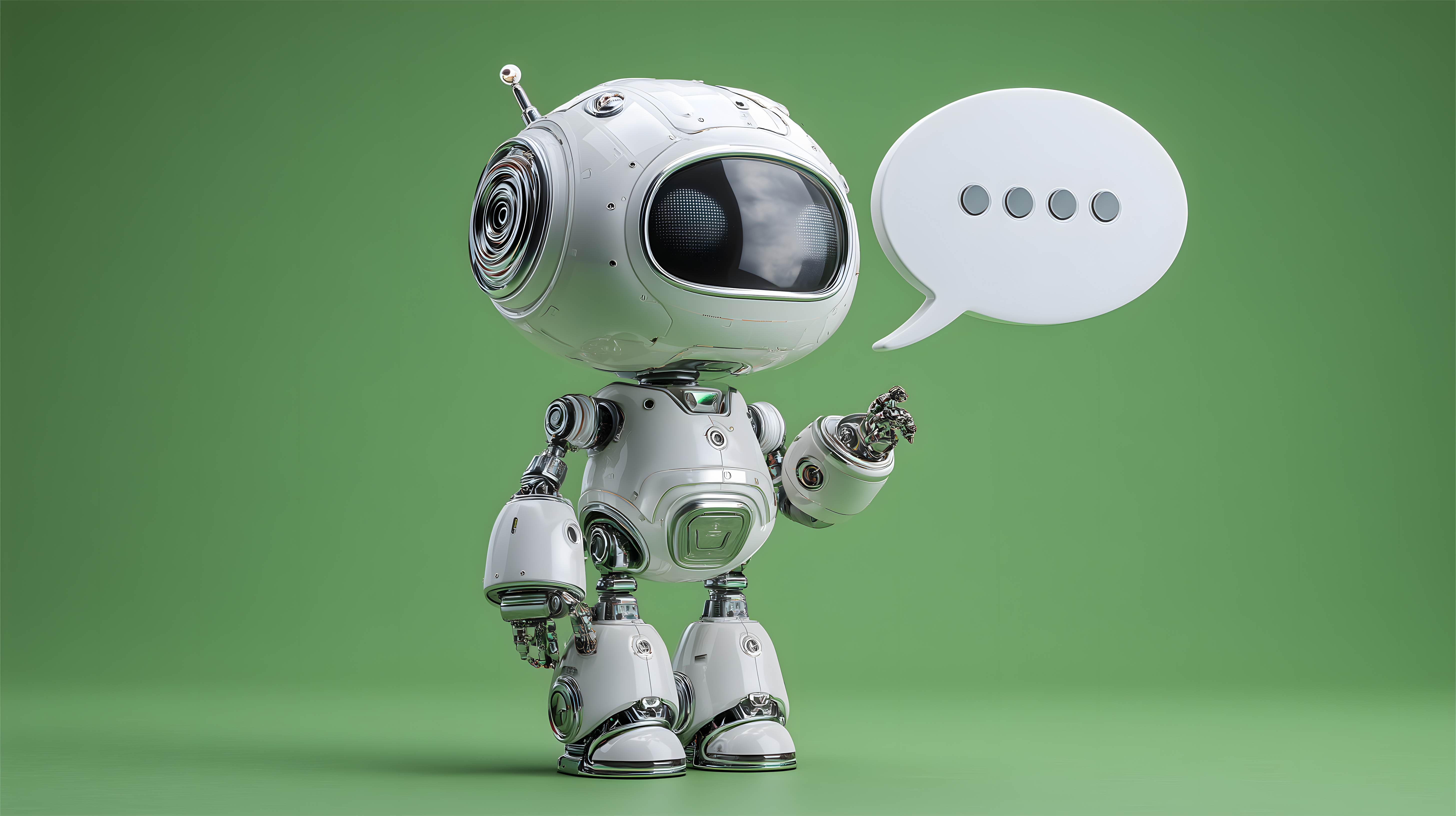 Dieses moderne 3D-Rendering zeigt einen niedlichen Roboter mit einer Sprechblase vor einem klaren, grünen Hintergrund. Der Roboter hat einen runden, kugelförmigen Körper mit verschiedenen technischen Elementen und Sensoren. Die Sprechblase suggeriert, dass der Roboter kommunizieren oder eine Botschaft übermitteln kann. Das Bild vermittelt einen futuristischen, innovativen und technologischen Eindruck und kann ideal für Blogbeiträge, Newsletter, soziale Medien oder Werbematerialien zu den Themen Künstliche Intelligenz, Digitalisierung oder Technologietrends verwendet werden. Dieses hochauflösende, kostenlose Stockfoto steht unter der Creative-Commons-Lizenz zur Verfügung.