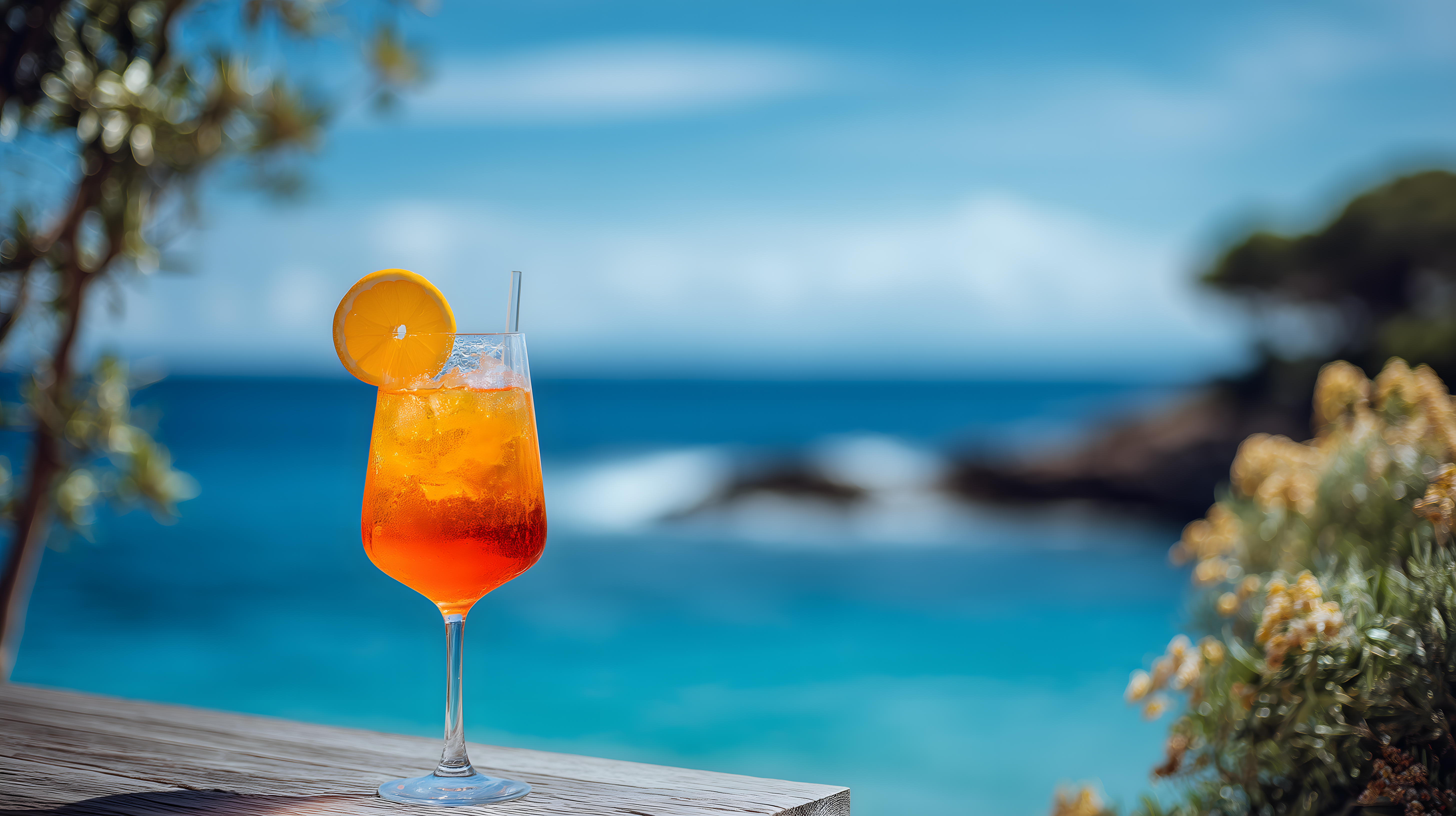 Dieses sonnige Foto zeigt einen perfekt gemixt Aperol Spritz in einem Weinglas. Der Cocktail ist mit einer Orangenscheibe garniert und steht auf einem Holztisch mit Blick auf das glitzernde Mittelmeer und den blauen Himmel. Die Szenerie strahlt pure Sommerfrische und Urlaubsstimmung aus. Dieses hochauflösende Stockfoto in warmen Farbtönen eignet sich hervorragend für Blogbeiträge, Werbekampagnen oder Social-Media-Postings rund um Reisen, Gastronomie und Genuss. Es steht unter einer Creative-Commons-Lizenz kostenlos zum Download zur Verfügung.