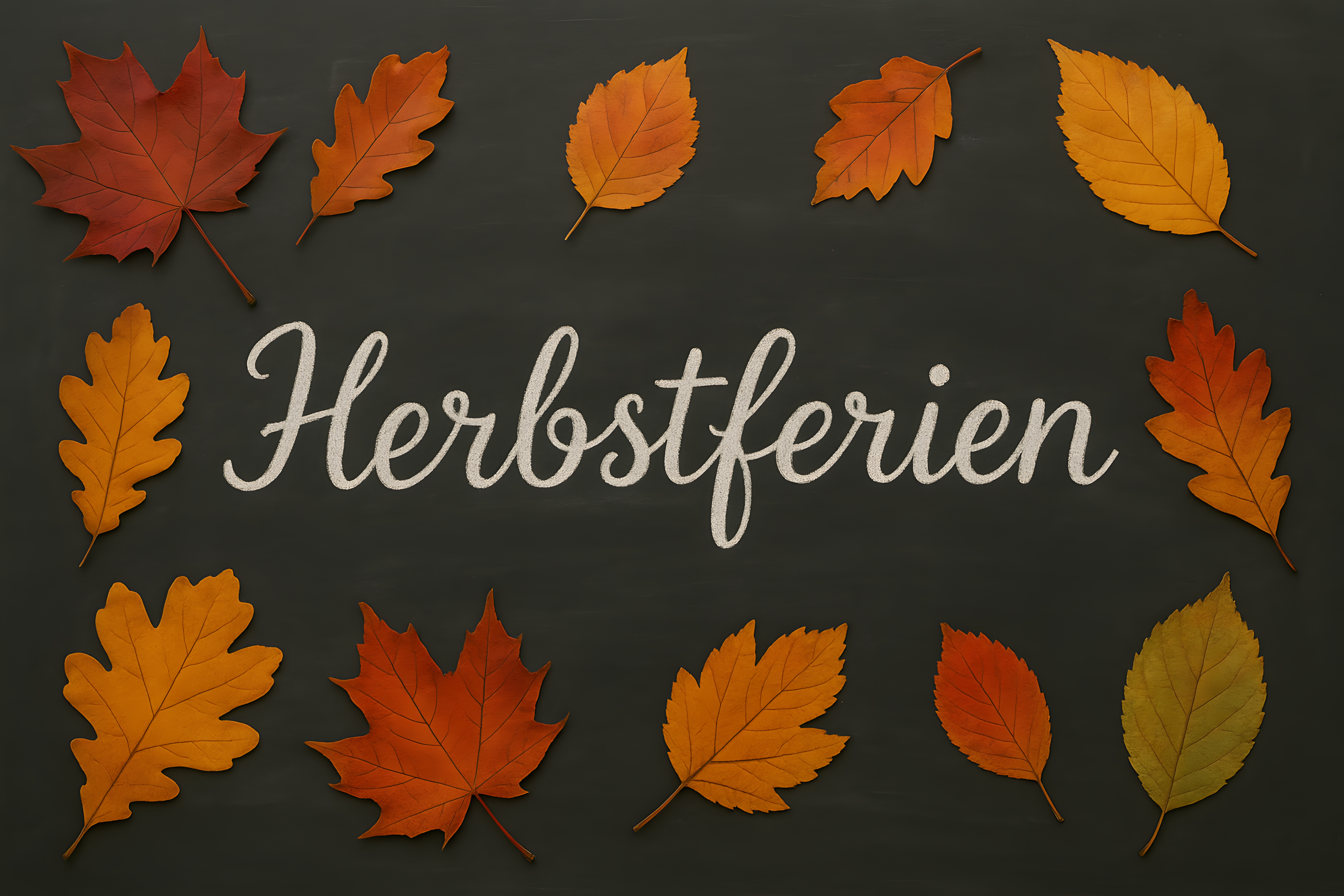 Dieses Foto zeigt eine Komposition aus bunten Herbstblättern auf einer dunklen Kreidetafel. Die Blätter in den typischen Herbstfarben Orange, Rot und Gelb sind um das handgeschriebene Wort 'Herbstferien' angeordnet, was eine gemütliche und rustikale Herbststimmung erzeugt. Der schwarze Hintergrund lässt den Fokus ganz auf die natürlichen Dekorationselemente fallen und bietet viel Platz für Texte oder Illustrationen. Dieses hochwertige Stockfoto eignet sich hervorragend für Blogs, Newsletter, Social-Media-Posts oder Werbematerialien rund um das Thema Herbst und Natur. Es ist in hoher Auflösung und unter einer Creative-Commons-Lizenz verfügbar.