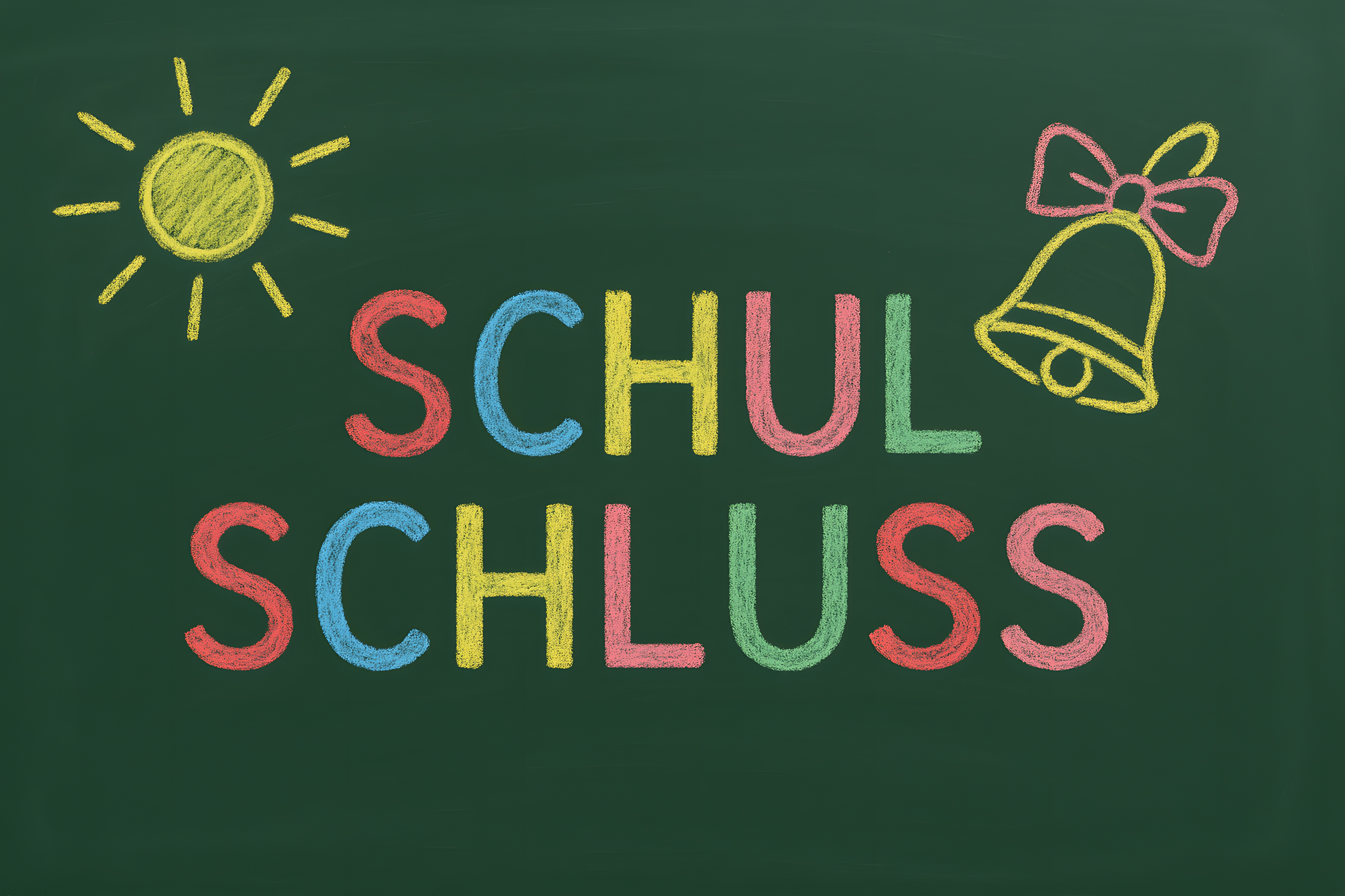 Dieses farbenfrohe Bild zeigt eine grüne Tafel mit der handgeschriebenen Aufschrift 'Schulschluss'. Umrahmt wird der Text von bunten Kreide-Symbolen wie einer Sonne und einer Schulglocke. Das Motiv vermittelt eine spielerische und freudige Stimmung rund um den Schulschluss und den Beginn der Ferien. Das Foto eignet sich gut für Verwendungen in Blogbeiträgen, Newslettern oder sozialen Medien im Kontext von Bildung, Schule oder Ferienzeit. Das hochauflösende Bild steht unter einer Creative-Commons-Lizenz kostenlos zur Verfügung.