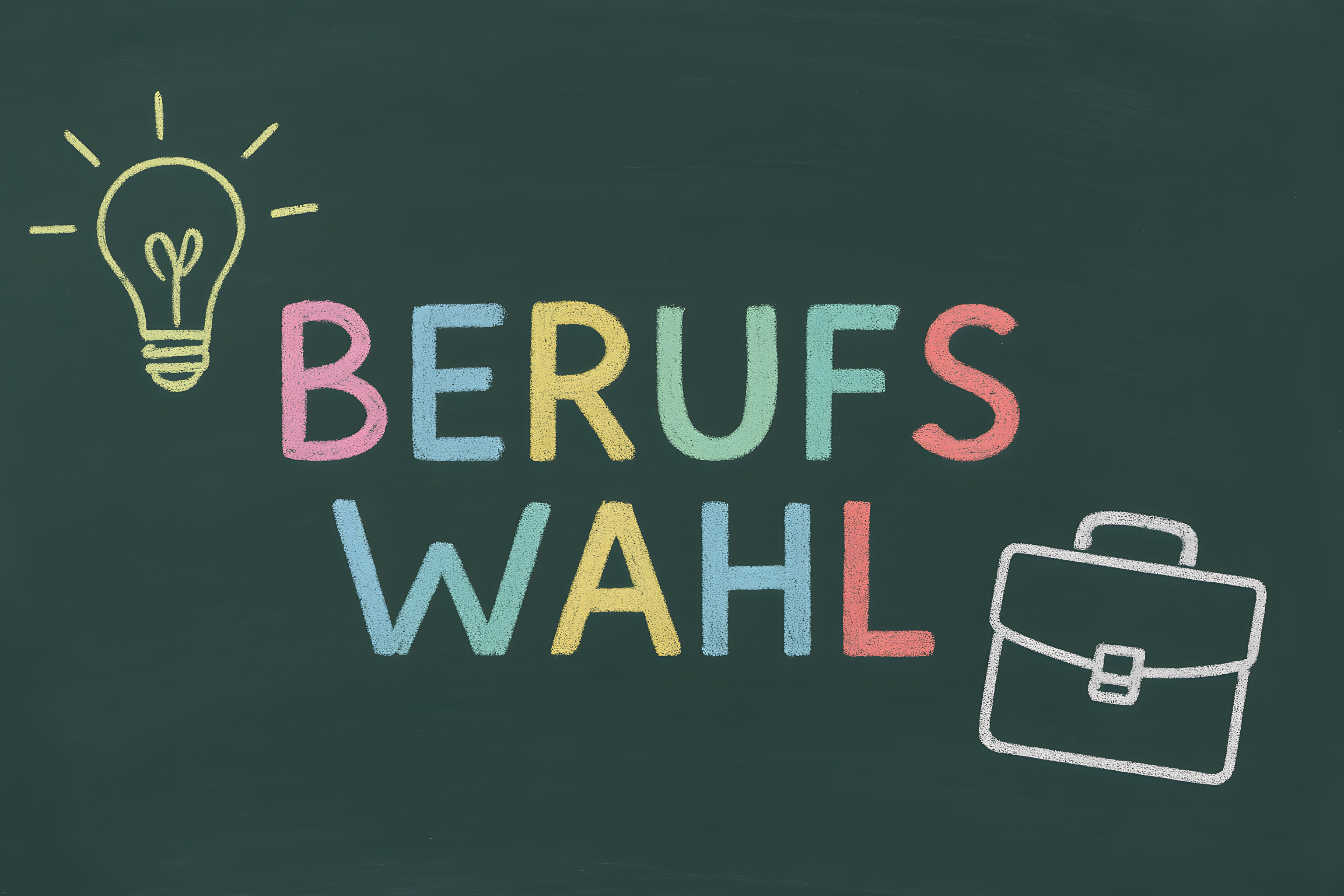 Das Bild zeigt eine Tafel, auf der in bunter Kreide der Begriff 'Berufswahl' geschrieben steht. Über dem Titel befindet sich eine einfache Glühbirne als Symbol für eine gute Idee oder Inspiration. Daneben ist ein stilisierter Aktenkoffer zu sehen, der für den Arbeitsplatz und eine berufliche Karriere stehen kann. Das Bild vermittelt den Eindruck von Entscheidungsfindung, Zukunftsplanung und Kreativität bei der Berufswahl.