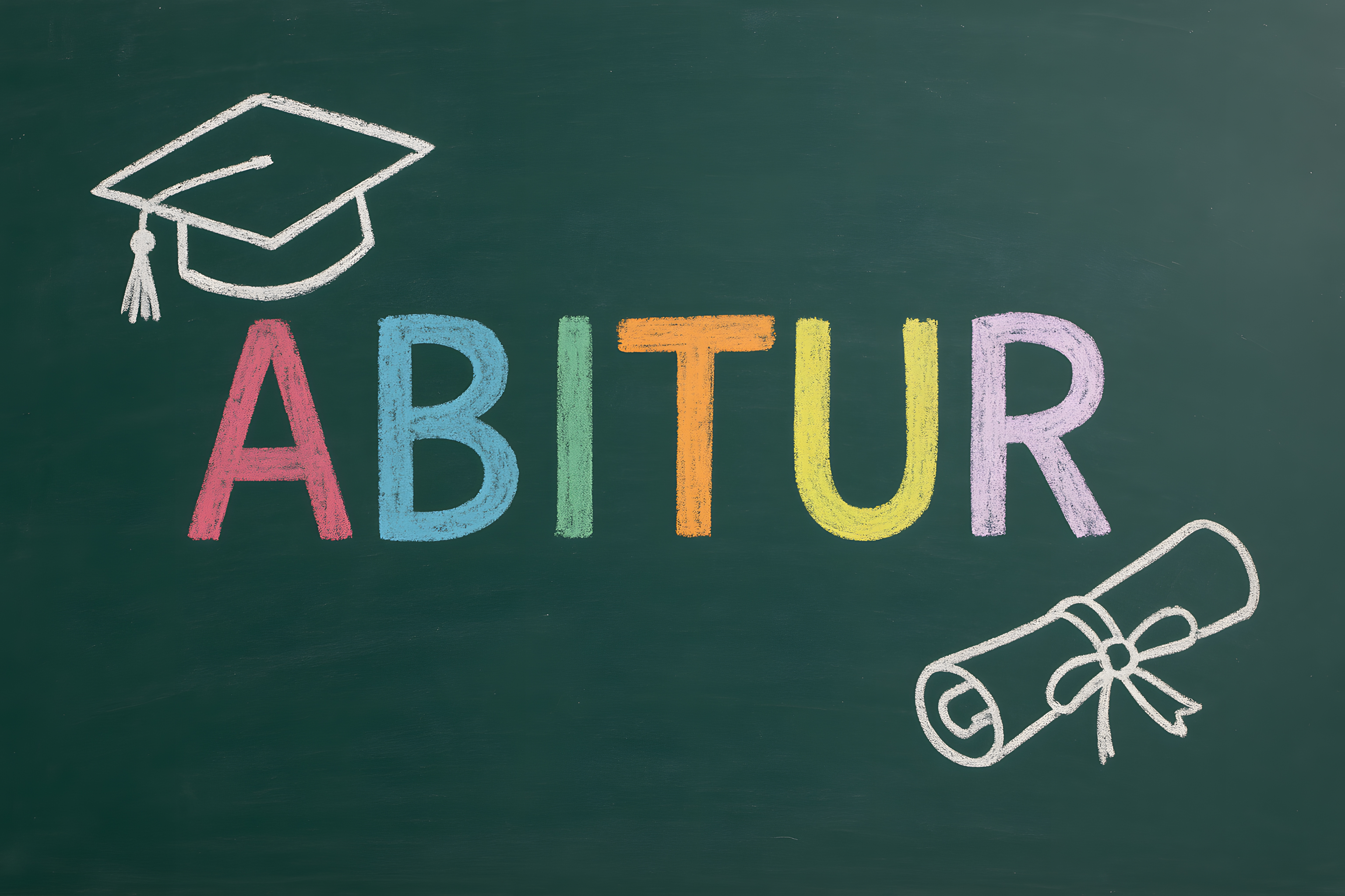 Das Bild zeigt einen farbenfrohen Schriftzug 'ABITUR' auf einer grünen Tafel. Der Schriftzug ist bunt gestaltet und mit einem Doktorhut links und einer Diplom-Rolle rechts verziert. Diese Symbole repräsentieren den erfolgreichen Abschluss der Schule und den Eintritt in eine neue Phase des Lebens. Das Bild vermittelt eine positive, fröhliche Stimmung und lässt sich gut in Blogbeiträgen, Newslettern oder Social-Media-Inhalten zum Thema Bildung, Studium oder persönliche Entwicklung einsetzen. Als kostenloses Stockfoto in hoher Auflösung unter einer Creative-Commons-Lizenz eignet es sich ideal für eine Vielzahl an Verwendungszwecken.