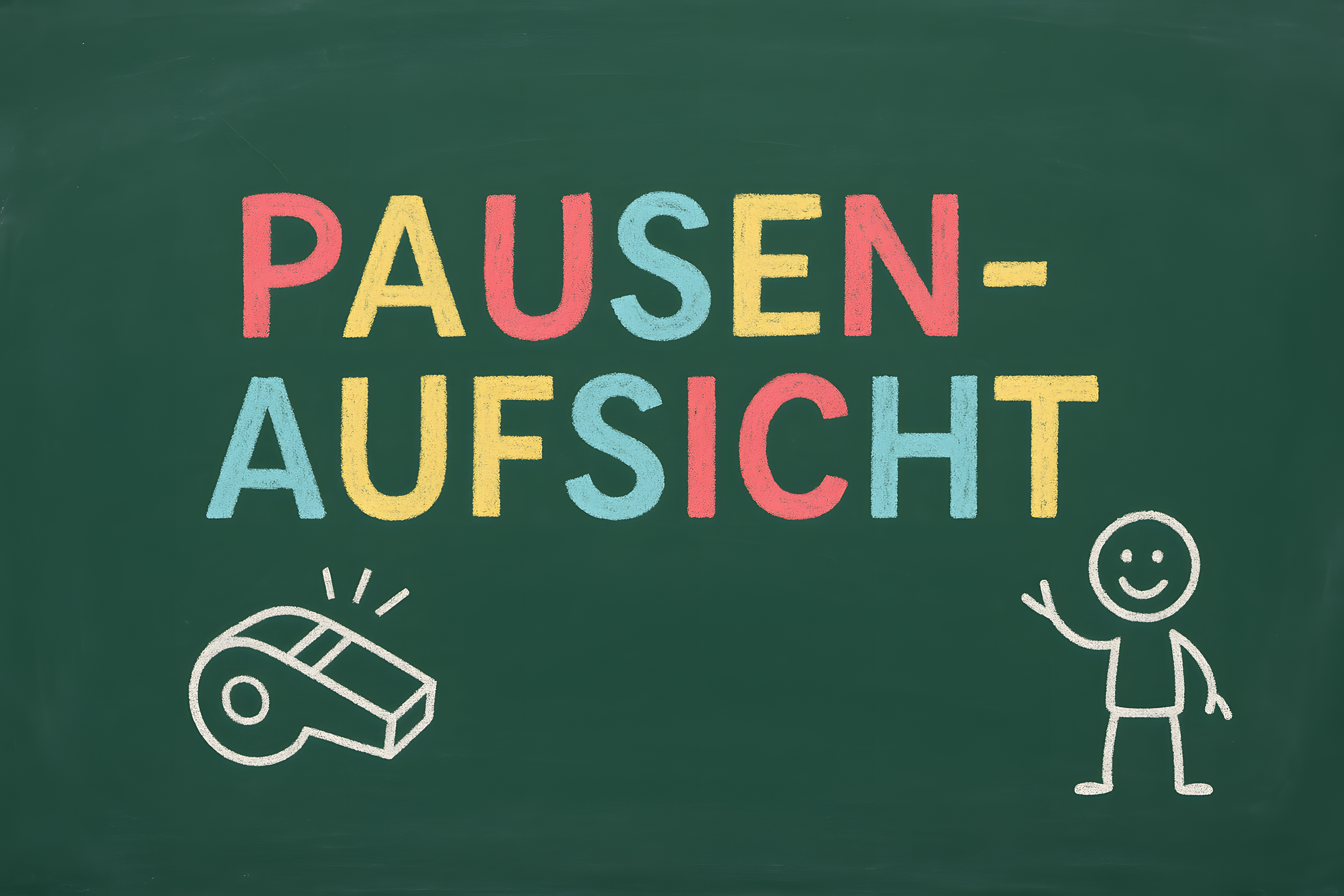 Das Foto zeigt eine bunte Tafel-Illustration zum Thema 'Pausenaufsicht'. Im Vordergrund sind die Worte 'PAUSEN-AUFSICHT' in verschiedenen Farben geschrieben. Darüber sind ein Pfeifensymbol und ein fröhliches Strichmännchen zu sehen, die den Pausenhof beobachten. Der Hintergrund ist in einem kräftigen Grün gehalten, was an eine klassische Schulkreidetafel erinnert. Diese fröhliche und kreative Darstellung eignet sich perfekt als kostenloses Stockfoto für Bildungsprojekte, Unterrichtsmaterialien oder Werbeaktionen zum Thema Schule und Lernen. Das hochaufgelöste Bild ist unter der Creative-Commons-Lizenz frei nutzbar.