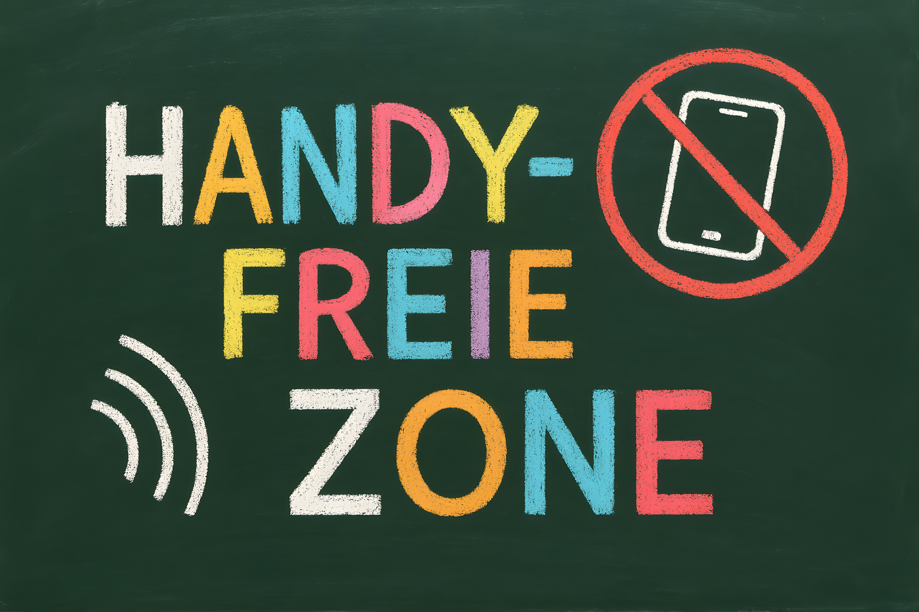 Das Bild zeigt eine grüne Tafel, auf der in bunter Kreide der Text 'Handy-freie Zone' geschrieben steht. Darunter befindet sich ein Verbotssymbol für Smartphones sowie ein Symbol für WLAN. Das Konzept vermittelt eine Umgebung, in der digitale Geräte und Ablenkung bewusst ausgeschlossen werden, um sich auf den eigentlichen Zweck - zum Beispiel Lernen oder Arbeit - konzentrieren zu können. Das Bild eignet sich gut für den Einsatz in Blogs, Newslettern oder Social-Media-Beiträgen rund um Themen wie Digitalisierung, Medienkompetenz oder Productivity. Als hochwertiges, kostenloses Stockfoto unter Creative-Commons-Lizenz kann es vielseitig in Projekten genutzt werden.