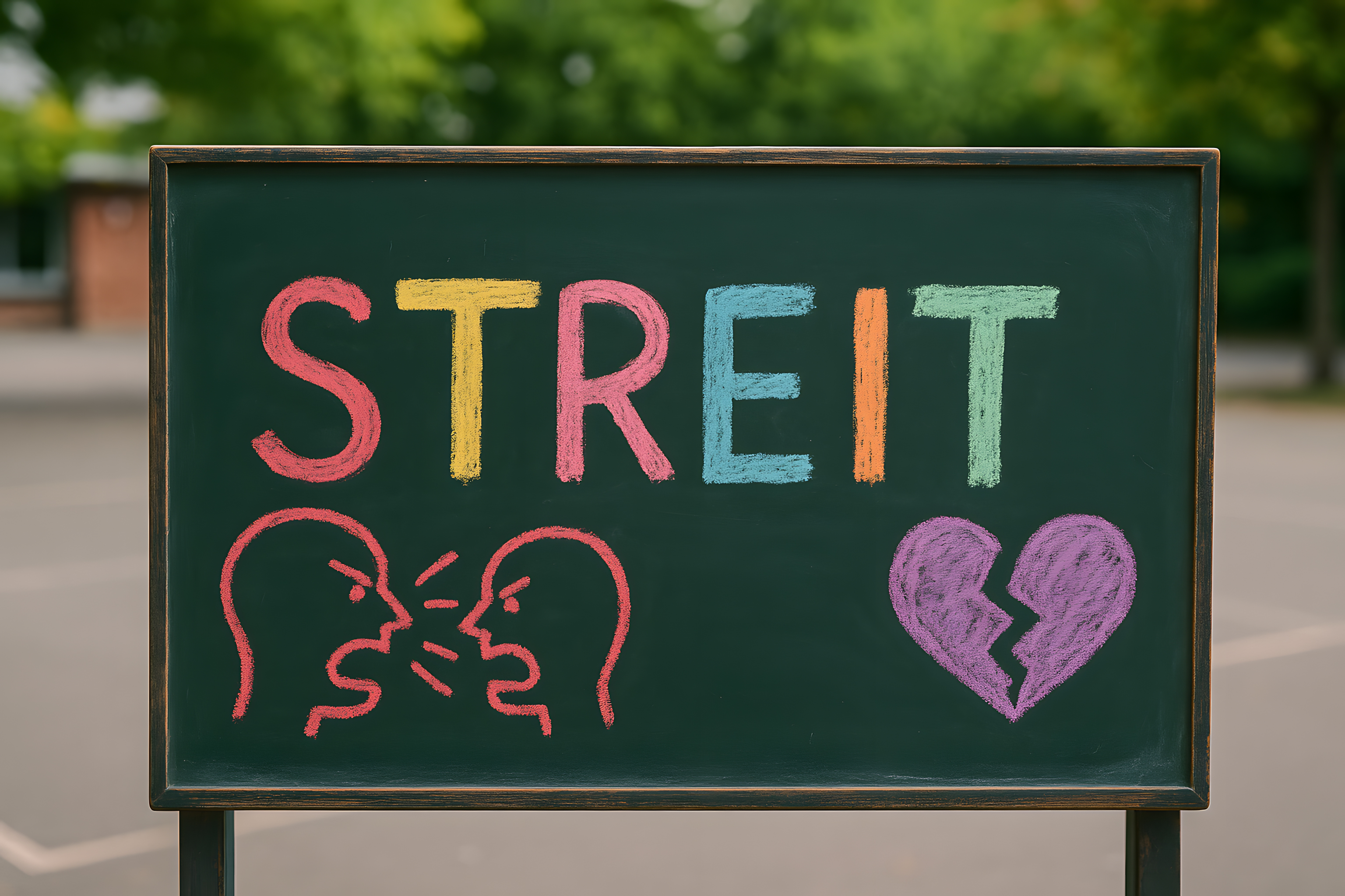 Das Bild zeigt eine Tafel, auf der mit bunter Kreide das Wort 'STREIT' sowie ein gebrochenes Herz-Symbol geschrieben sind. Die Tafel ist vor einem unscharfen, grünen Hintergrund platziert, was einen naturnahen Kontext vermittelt, wie etwa ein Klassenzimmer im Freien. Das farbenfrohe, grafische Element auf der Tafel sticht deutlich hervor und symbolisiert Konflikte, Auseinandersetzungen sowie emotionale Belastungen. Dieses Stockfoto eignet sich hervorragend für Beiträge in Blogs, Newslettern oder sozialen Medien, die sich mit zwischenmenschlichen Problemen, Beziehungsfragen oder Kommunikationsthemen befassen. Es ist in hoher Auflösung verfügbar und unter einer Creative-Commons-Lizenz frei nutzbar.