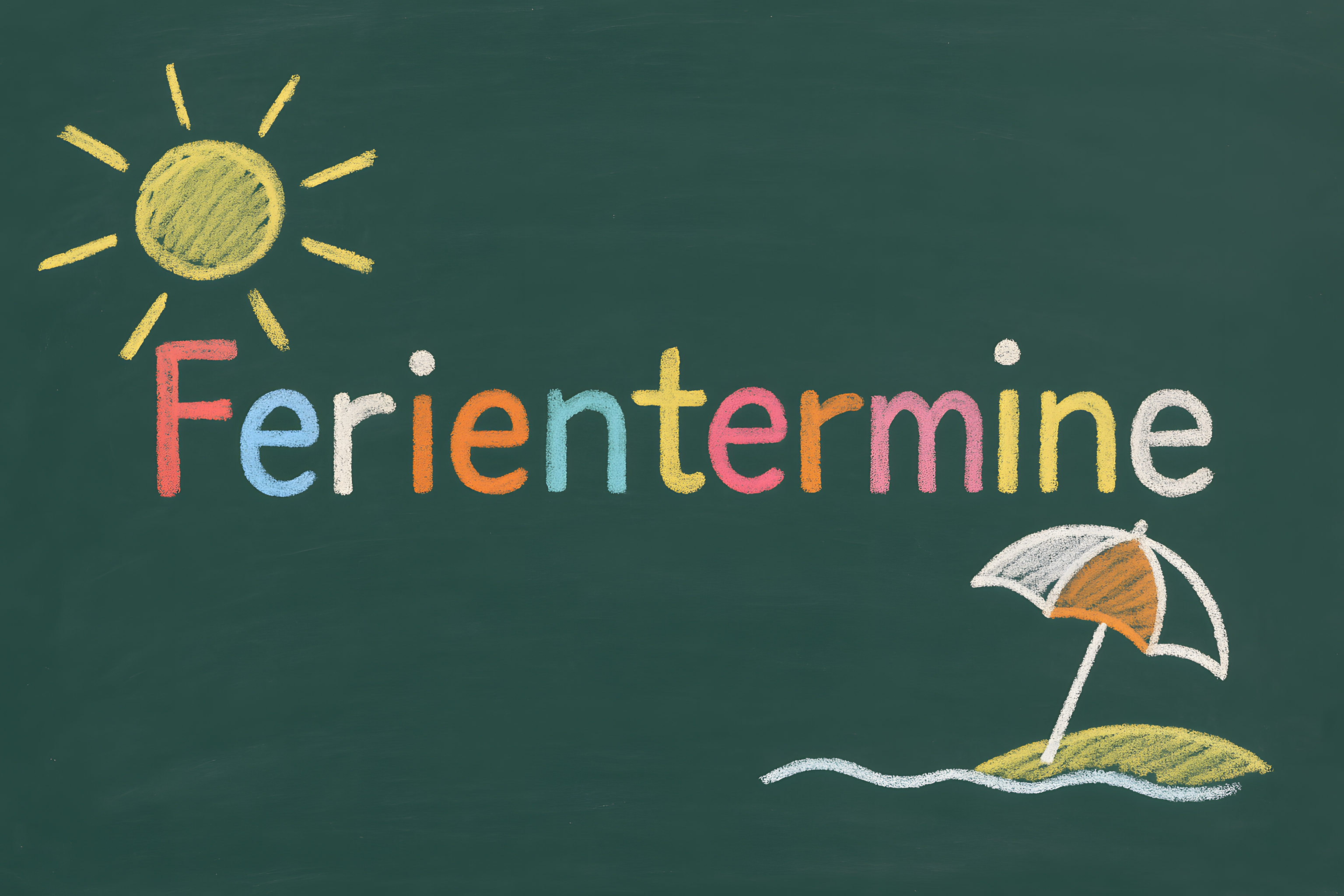 Das Bild zeigt eine Tafelkreide-Illustration mit dem bunten Schriftzug 'Ferientermine' sowie einem simplen Sonnenschirm-Symbol. Der grüne Hintergrund lässt den Schriftzug und das Symbol gut zur Geltung kommen und vermittelt eine sommerliche, entspannte Stimmung. Diese Szene eignet sich hervorragend als kostenloses Stockfoto für Blogs, Newsletter, Social-Media-Beiträge oder andere Werbematerialien rund um Reisen, Urlaub und Ferien. Die hochauflösende Grafik ist unter Creative-Commons-Lizenz frei verwendbar.