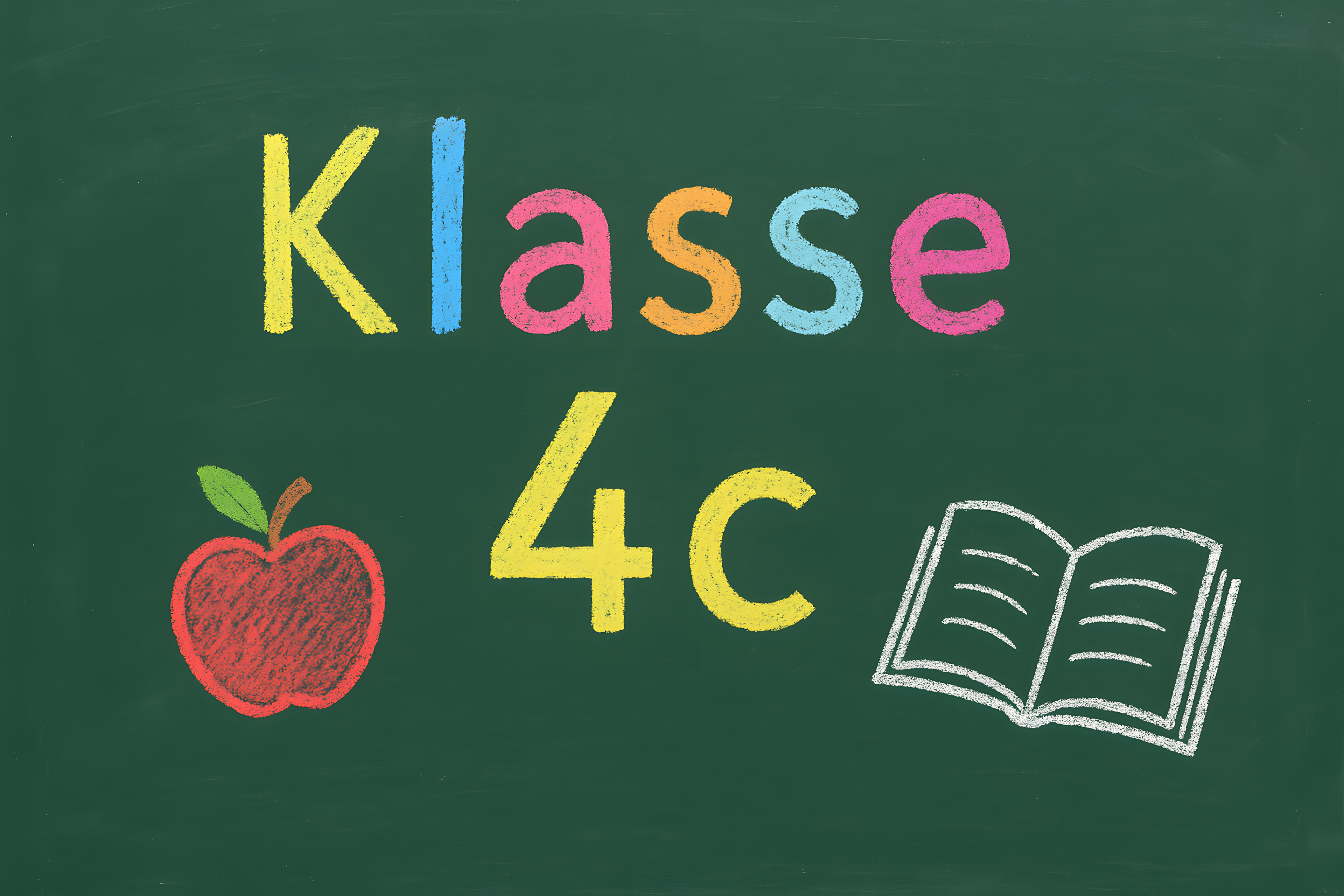 Das Bild zeigt eine farbige Kreidezeichnung an einer Tafel. Sie zeigt den Schriftzug 'Klasse 4c' sowie Symbole wie einen Apfel und ein aufgeschlagenes Buch. Die Gestaltung wirkt kindlich und kreativ, was auf einen Lernkontext in der Grundschule oder einem Kindergarten hinweist. Das Foto eignet sich hervorragend als kostenloses Stockfoto für Blogs, Newsletter oder Social-Media-Beiträge rund um das Thema Bildung, Schule und Lernen. Die Auflösung ist hochwertig und das Bild steht unter einer Creative-Commons-Lizenz zur Verfügung.