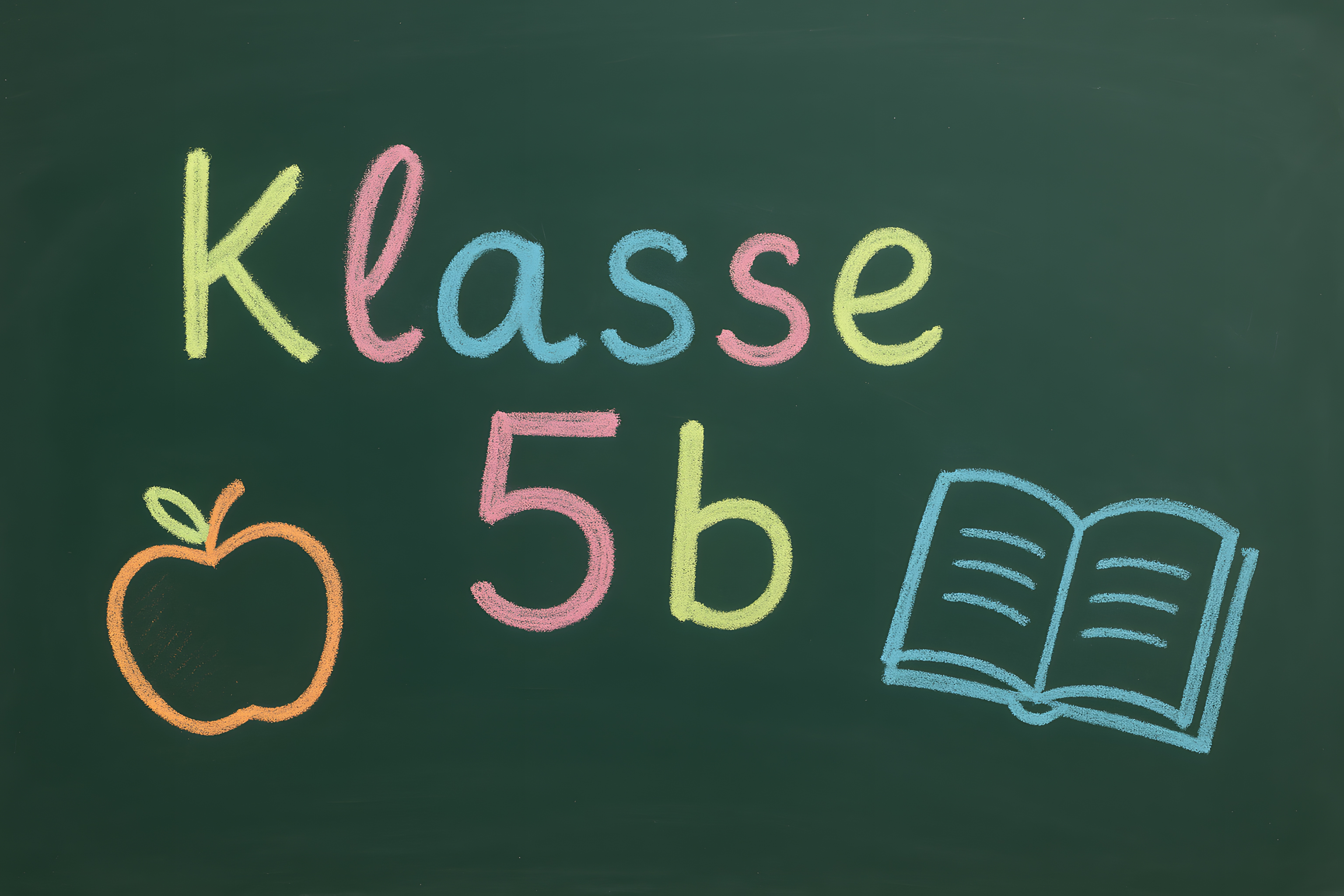 Das Bild zeigt eine grüne Kreidetafel, auf der mit bunter Kreide 'Klasse 5b' geschrieben steht. Daneben sind ein Apfel und ein geöffnetes Buch abgebildet, die typische Symbole für Schule und Lernen darstellen. Die Komposition ist schlicht und übersichtlich, wodurch der Fokus auf den Schriftzug und die Lehrmittel gelegt wird. Dieses Stockfoto eignet sich hervorragend für Illustrationen rund um Themen wie Bildung, Unterricht, Schule und Lernen. Mit seiner hohen Auflösung und der Creative-Commons-Lizenz kann es kostenfrei für verschiedene Anwendungen, wie Blogs, Newsletter, Social-Media-Beiträge oder Werbematerialien, genutzt werden.