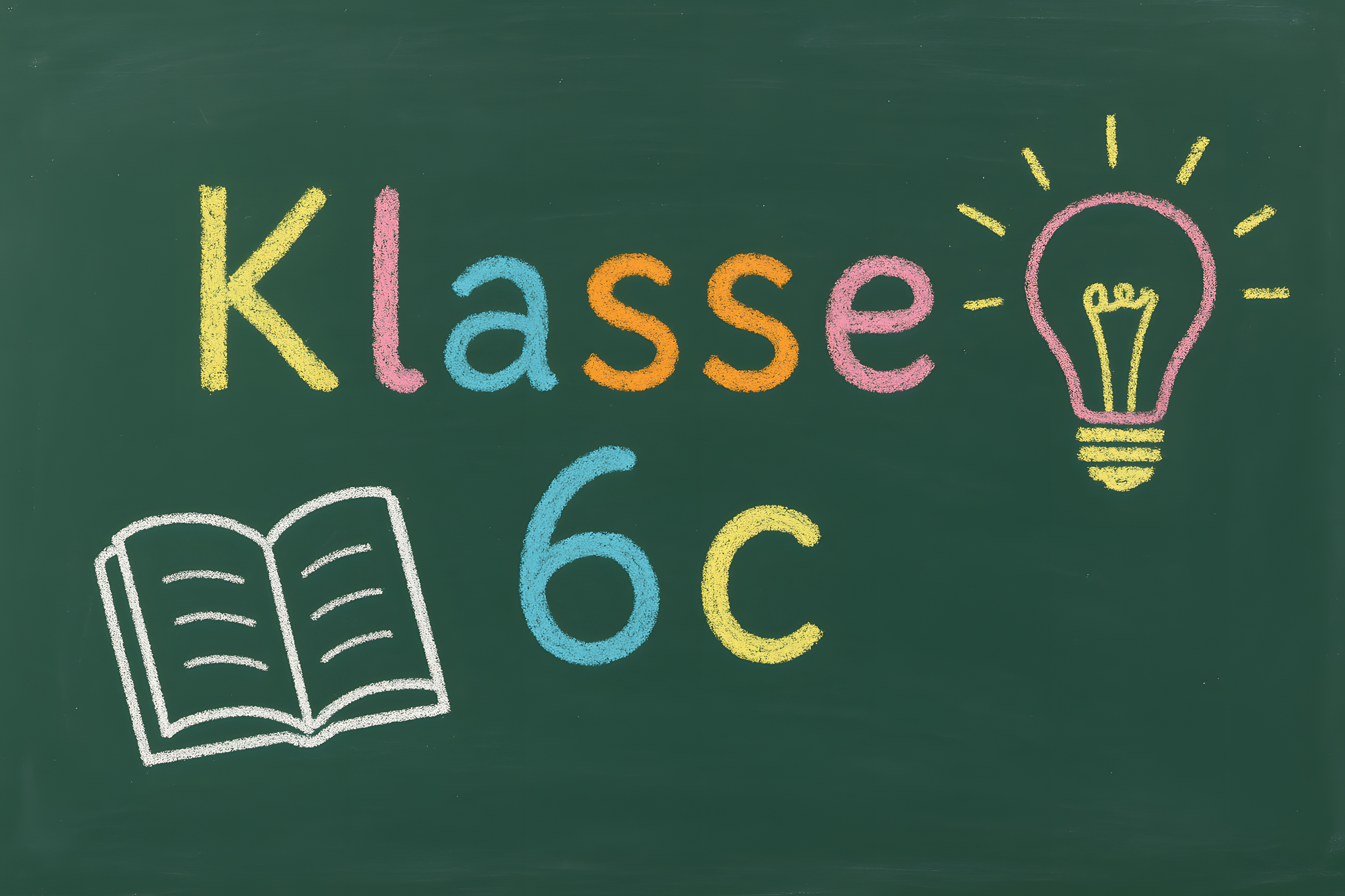 Das Bild zeigt eine grüne Tafel im Klassenzimmer, die mit bunter Kreide beschriftet ist. Zu sehen sind die Worte 'Klasse 6c' sowie eine Glühbirne als Symbol für eine Idee. Dieses kostenloses Stockfoto in hoher Auflösung unter Creative-Commons-Lizenz eignet sich ideal für Blog-Beiträge, Newsletter oder Werbematerial rund um das Thema Bildung, Schule und Lernen.