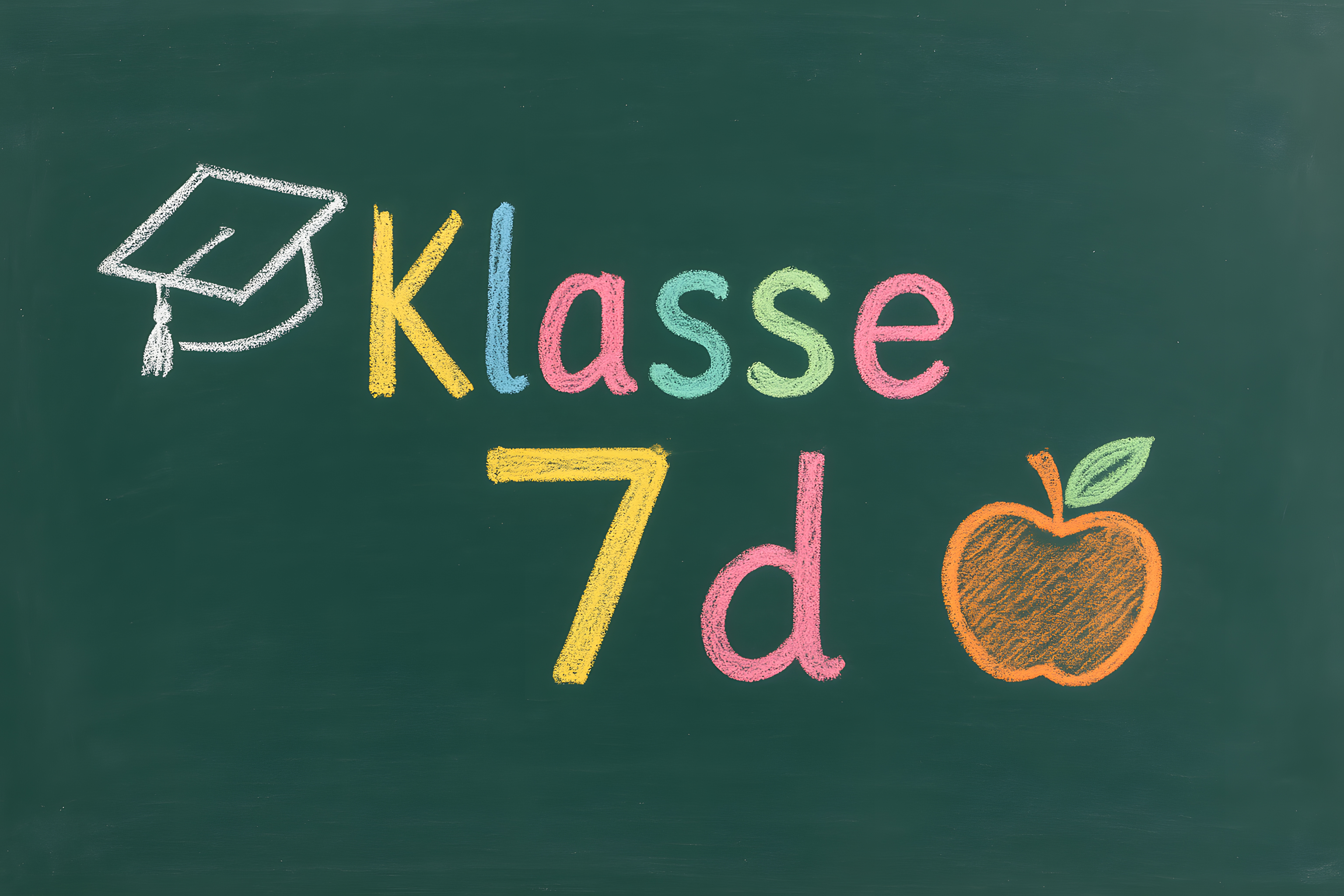 Dieses Bild zeigt eine grüne Schultafel, auf der mit bunter Kreide 'Klasse 7d' sowie ein Absolventen-Symbol und ein Apfel gemalt sind. Die farbenfrohe, handgemalte Darstellung vermittelt ein kreatives und lernfreudiges Ambiente, wie es typischerweise in Klassenzimmern oder Schulen zu finden ist. Das Foto eignet sich hervorragend als kostenloses Stockfoto für Beiträge rund um Bildung, Schule, Ausbildung oder Studium in hoher Auflösung und unter einer Creative-Commons-Lizenz.